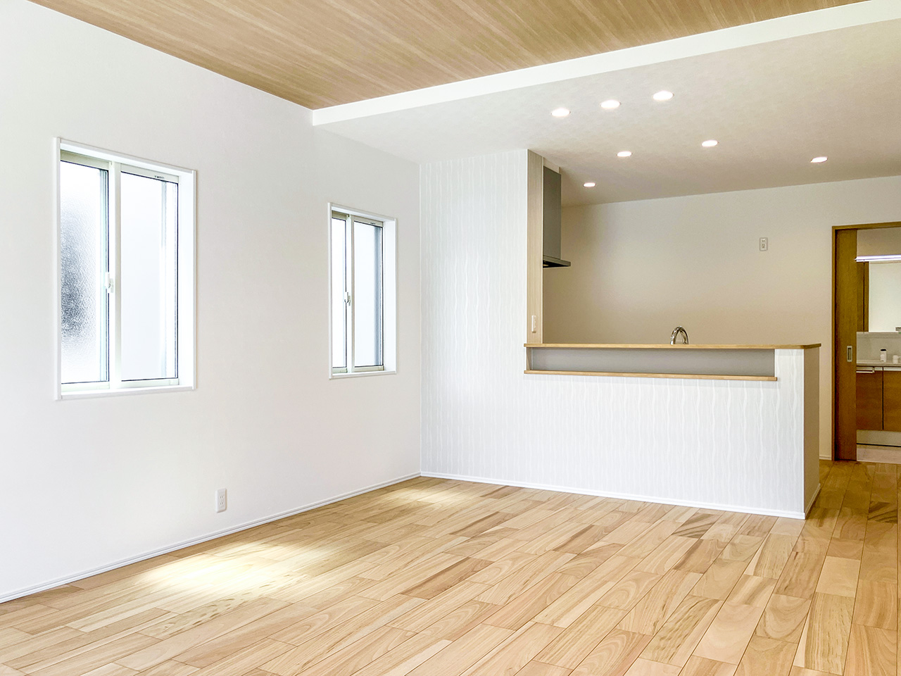 キッチンから洗面室・浴室までを最短距離で結んだ水回り動線設計。家事の移動距離を短縮するとともに、動線上には収納スペースなどをレイアウトし機能性も高めました。スマートな動線設計と時短設備が子育てにがんばるご家族をサポートします。