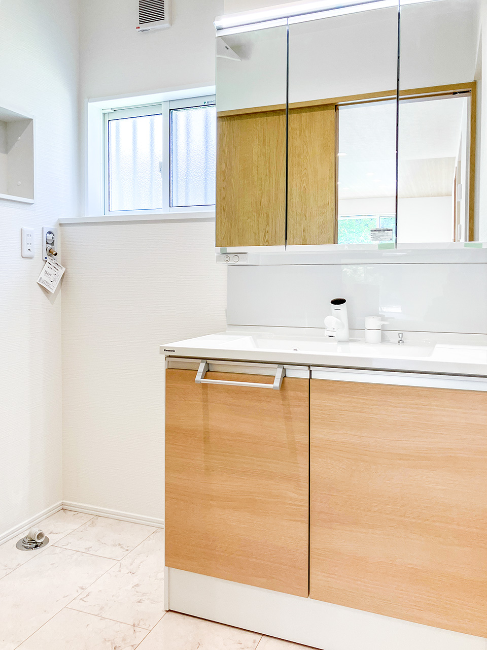 900mm幅の洗面化粧台なので広く使え、毎日の作業もグンと楽になります。ゆとりの収納力でサニタリールームをすっきりと演出します。