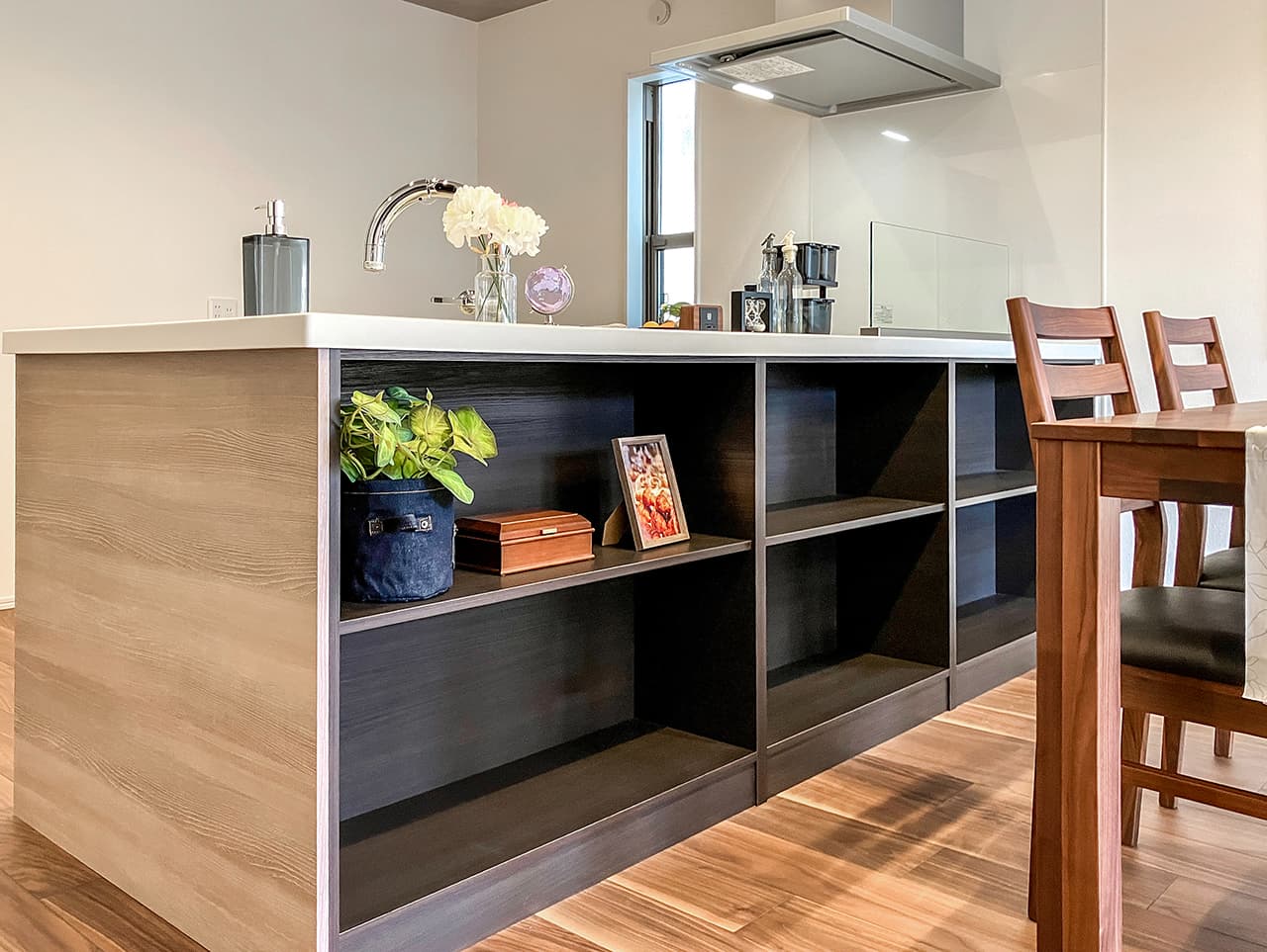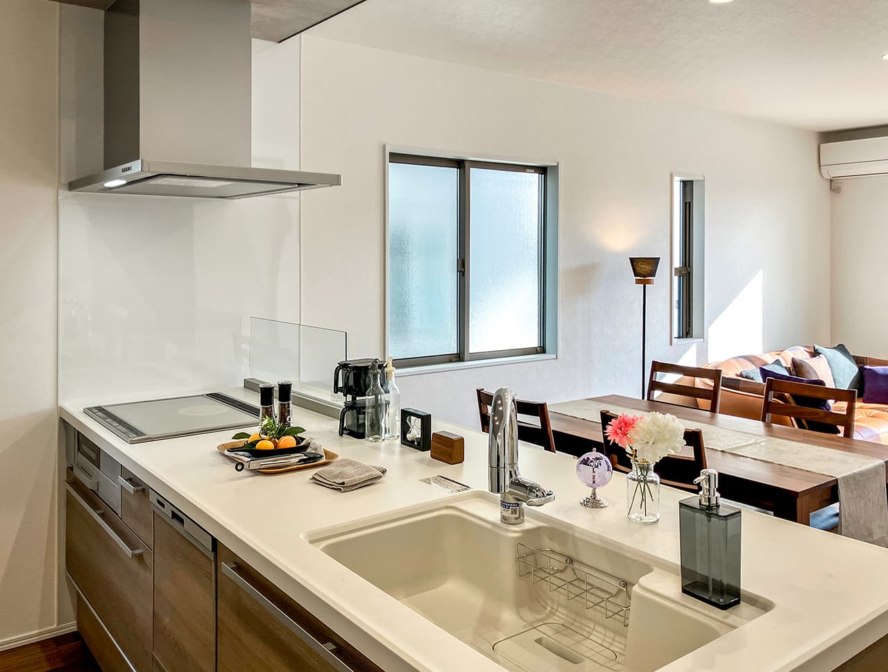 LDK空間の広さをより実感できるオープンキッチン。開放的で目線を遮るものがなくコミュニケーションが取りやすいため、料理をしながらの会話も弾み、お手伝いにも気軽に参加できます。