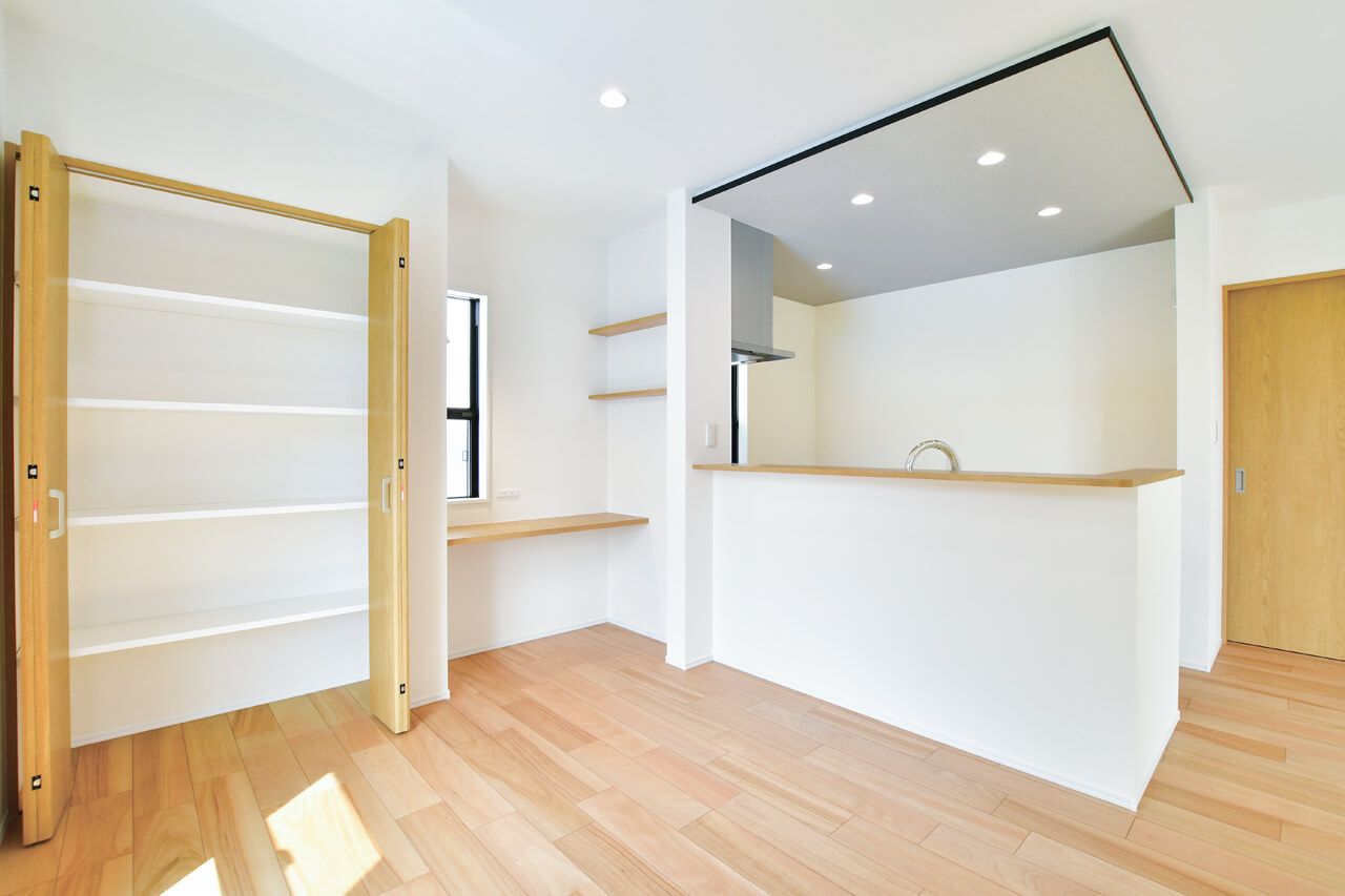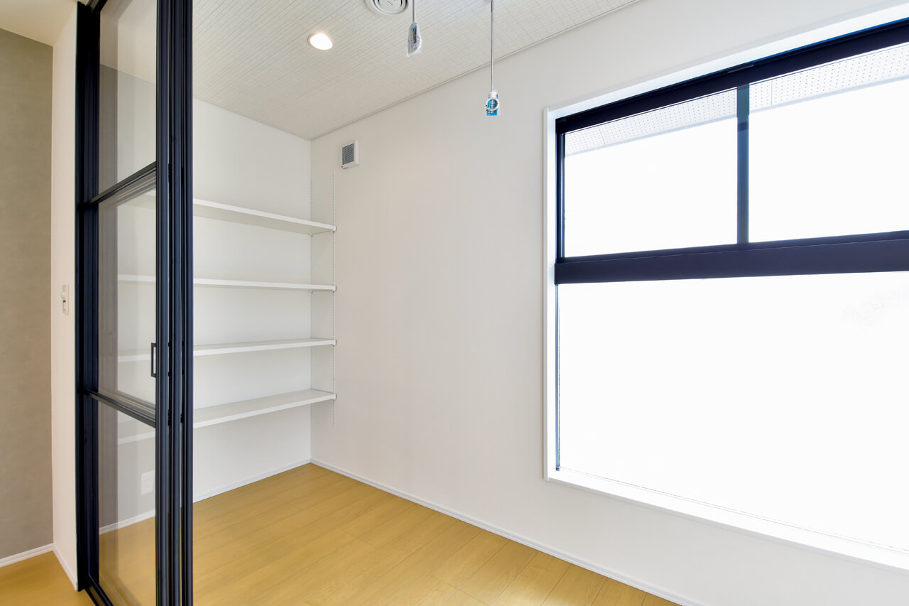 リビングそばに、家族がみんなが使いやすいたっぷり収納できるストレージをご用意。日用品や生活雑貨はもちろん、お子様のおもちゃなど、様々な収納に活用できます。日常の収納以外にも、来客時には、散らかった雑誌やおもちゃなども手早く片づける事ができます。