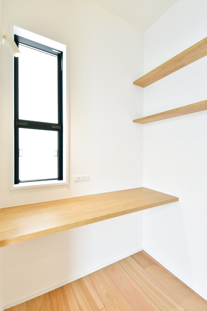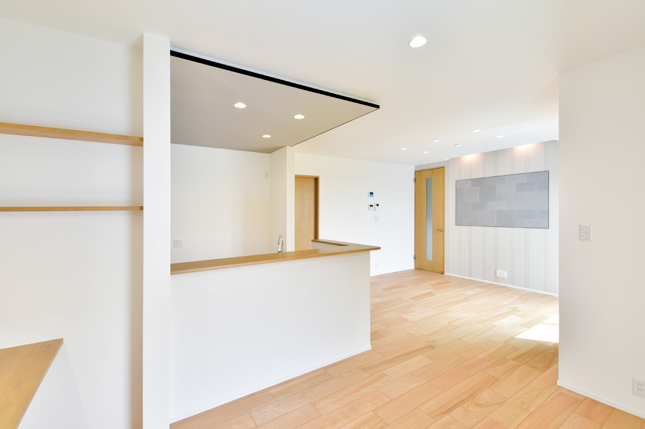 LDKにレイアウトしたカウンタースペース。子ども達の学習スペースやパパのSOHOスペース、ママのワーキングスペースなど、用途やスタイルに応じて多彩に活躍。家族のそばでみんなが利用できるライブラリー空間です。