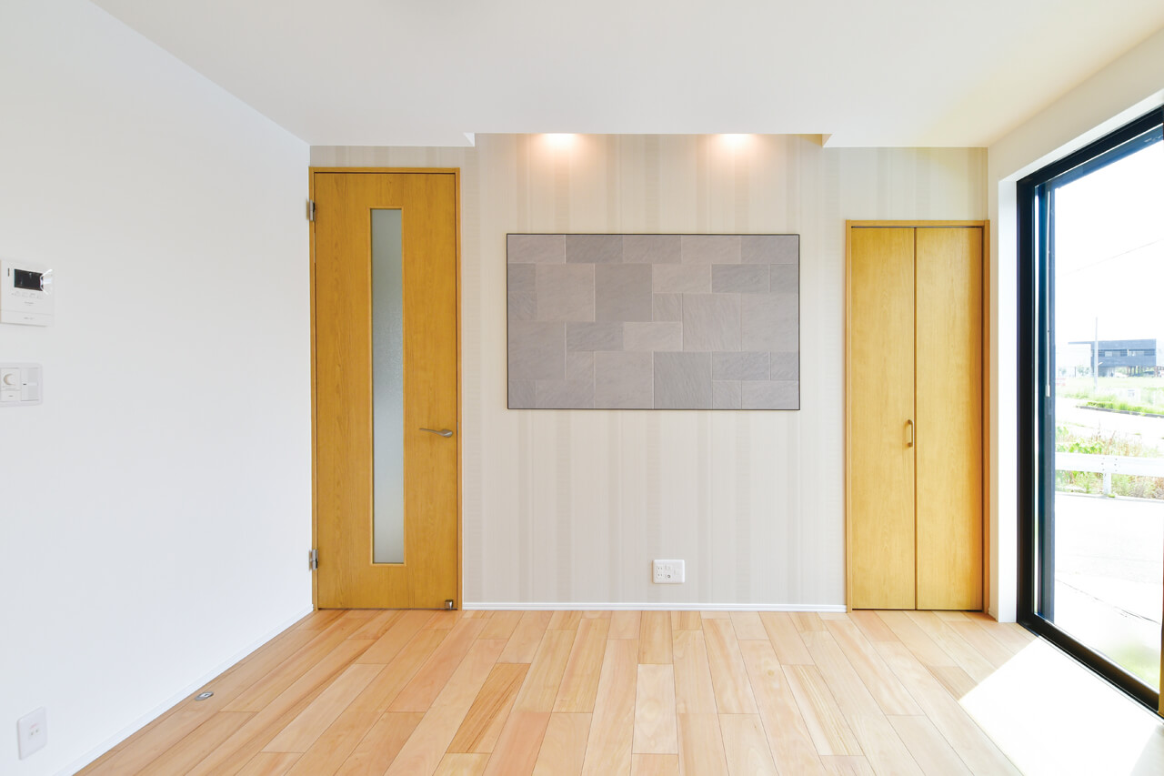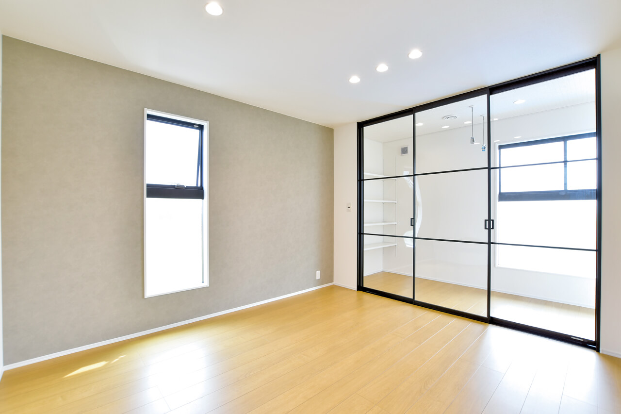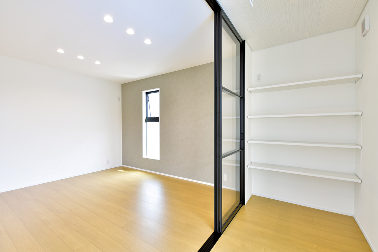 2つの空間に間仕切り可能な、広々とした2階2ドア1ルーム。子供が生まれる前、赤ちゃんが生まれてから、そして大きくなって個室を持つようになるまで対応。子ども達が独立したら広々としたご夫婦の書斎や趣味の部屋にも。ご家族の成長といっしょに変わっていく自由な家づくりが可能です。※間仕切り壁の設置は有料オプションとなります。