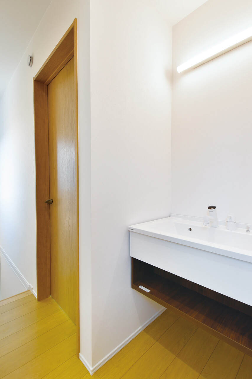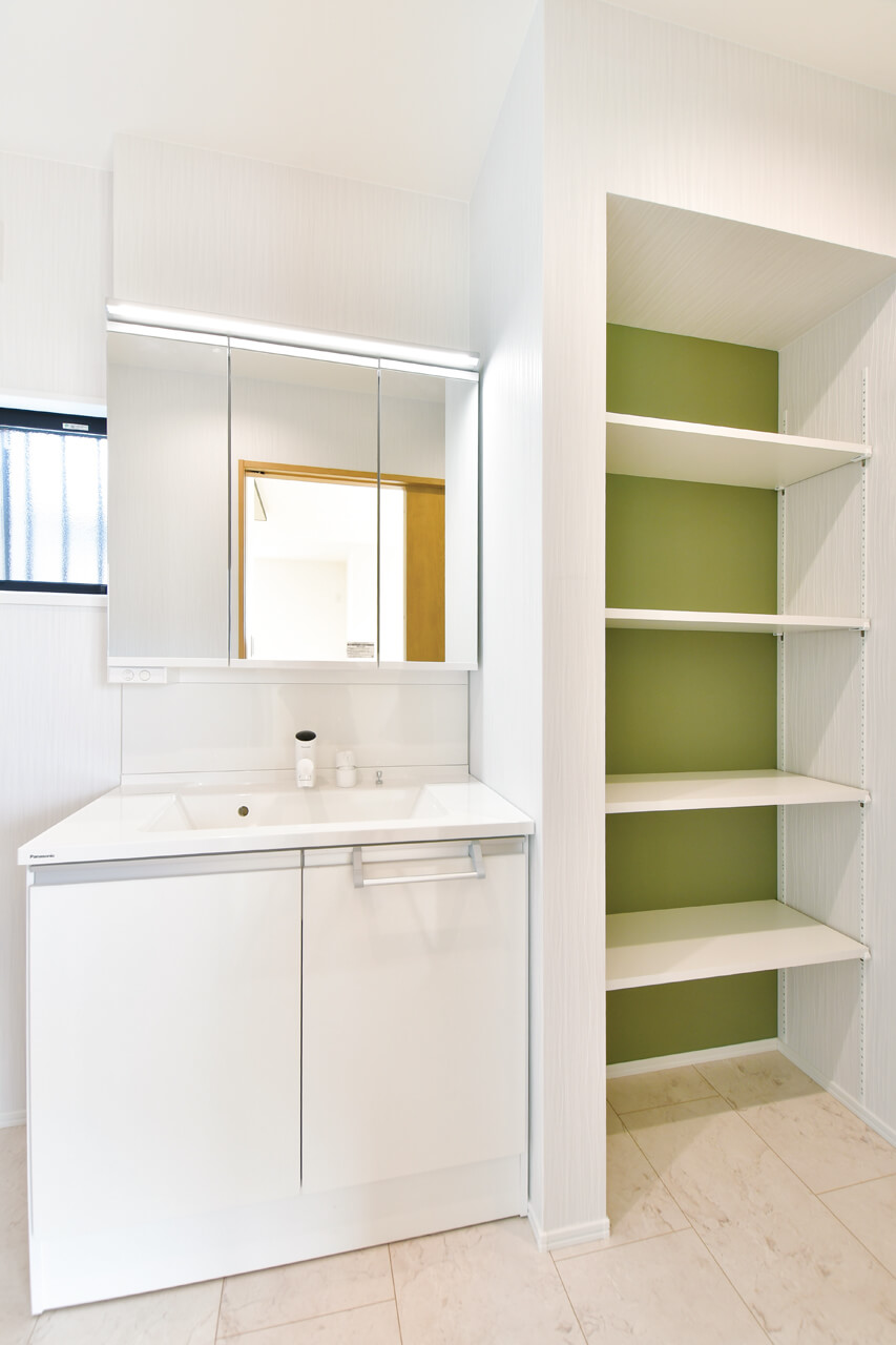 タオルや洗濯用品などのストックに嬉しいリネン庫。入浴後の下着やパジャマの置き場所としてもとっても便利。カゴやケースを利用して、バスタオルや下着類、洗濯物など種類別に整理して、見た目も使い勝手もスマートに。そのまま洗濯機に入れたくない汚れた洗濯物は一番下のスペースに。家族のなかでルールを決めて誰でも使いやすく。子ども達の自主性も育みます。