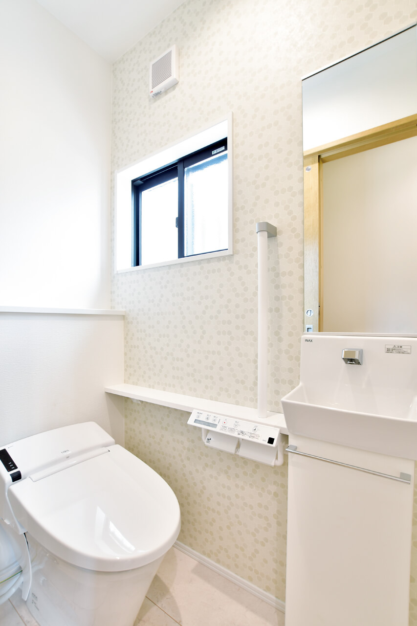 座る・立つといった動作が足腰への大きな負担をかけるトイレ。握りやすい位置に手すりを設置して、負担の軽減に配慮しています。