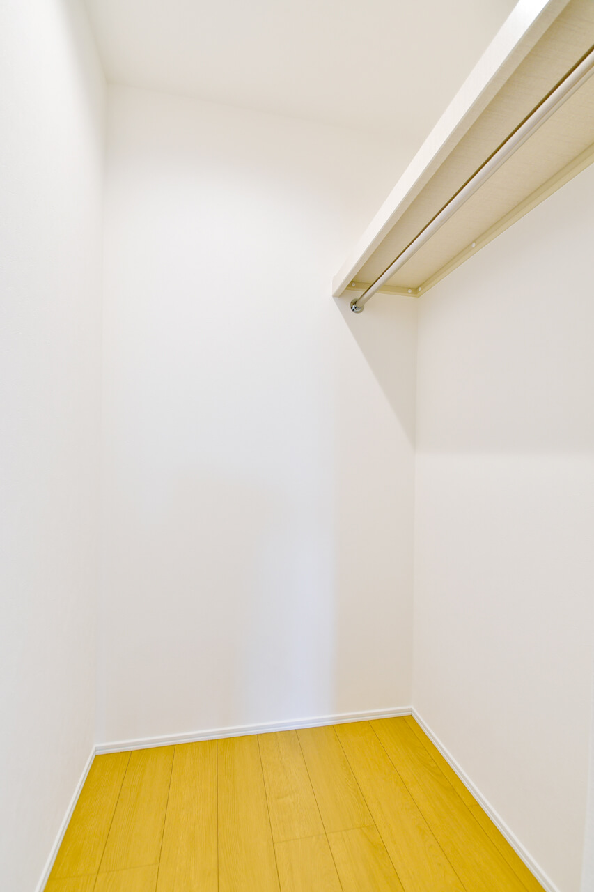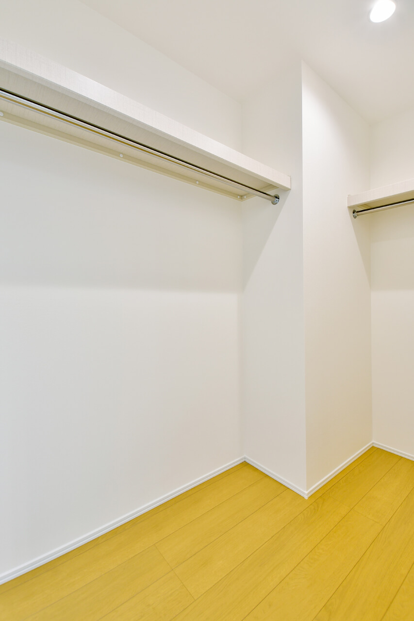 ご夫婦や子ども達の衣類をたっぷりしまえる大容量のウォークインクローゼット。季節の衣類から鞄や帽子などの小物までたっぷり保管可能。ウォークインタイプなので衣類の出し入れや整理整頓もスムーズに行えます。