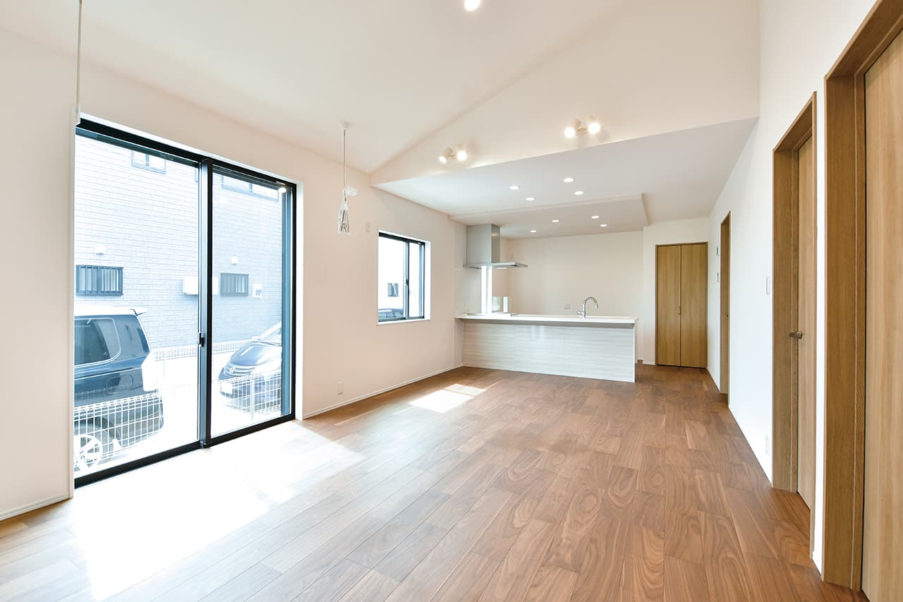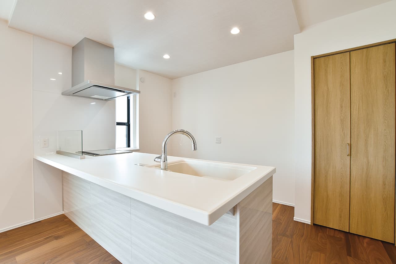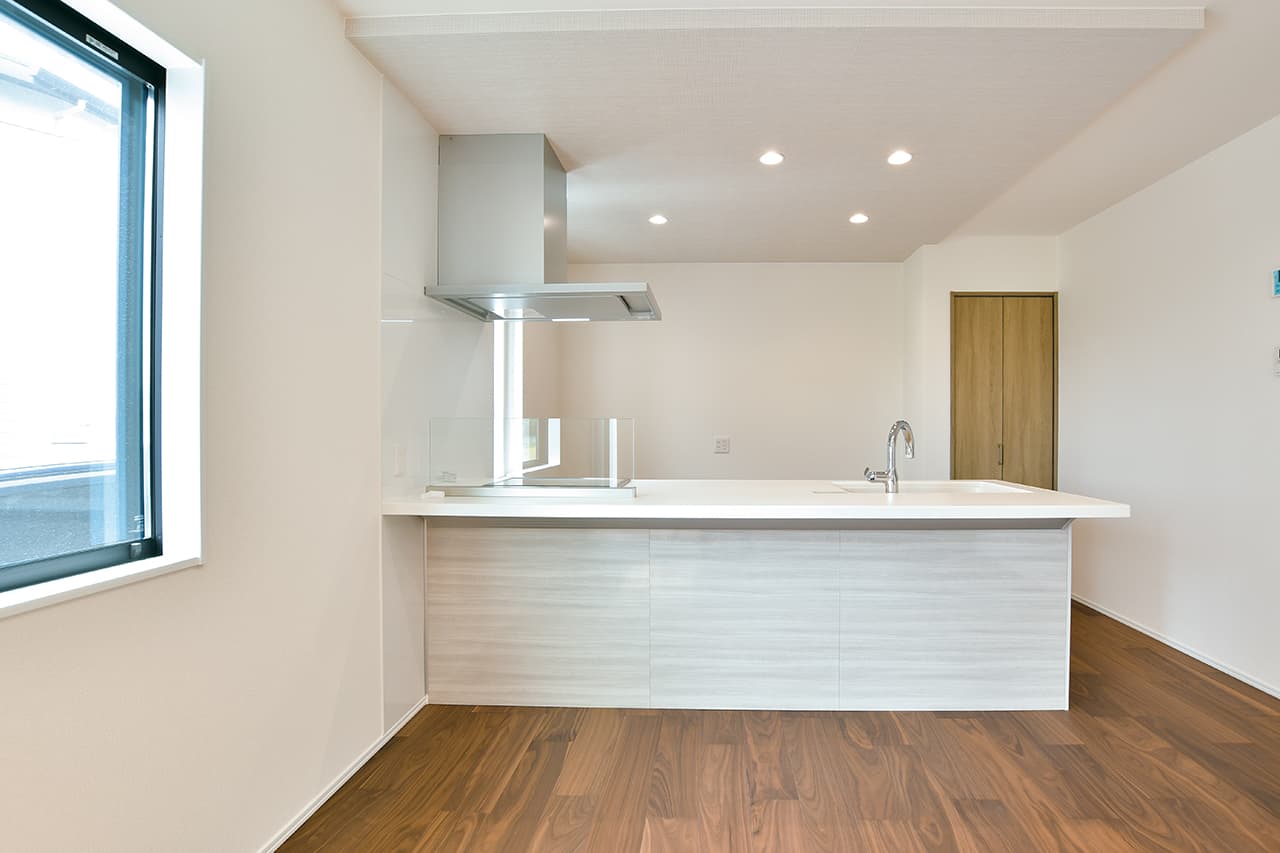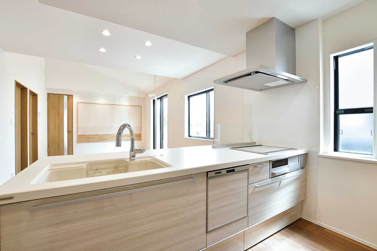 LDK空間の広さをより実感できるオープンキッチン。開放的で目線を遮るものがなくコミュニケーションが取りやすいため、料理をしながらの会話も弾み、お手伝いにも気軽に参加できます。