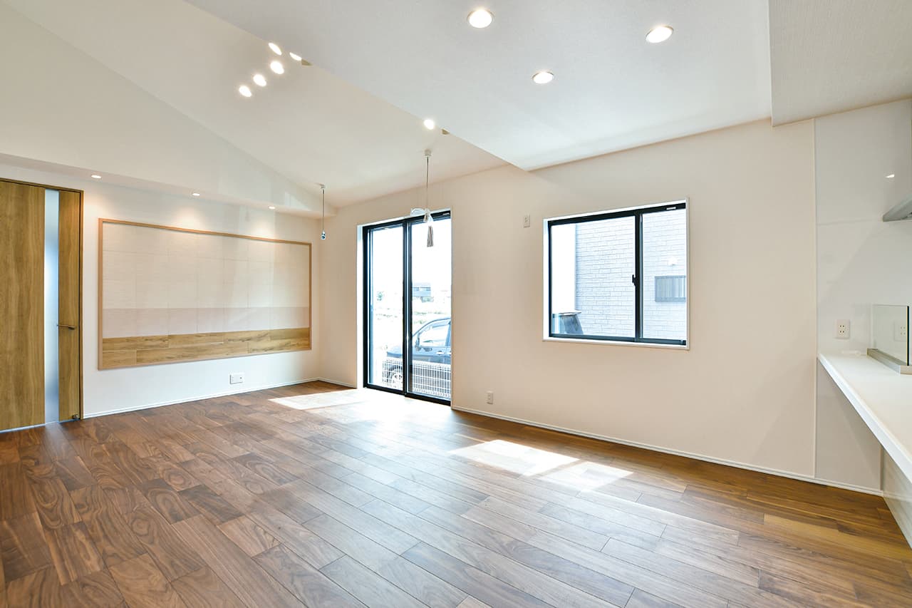 屋根の角度を生かした開放感あふれる勾配天井。高い位置に設けた窓からは空が望め、晴れた日には明るい陽光が差し込みます。