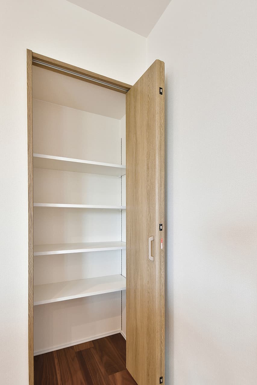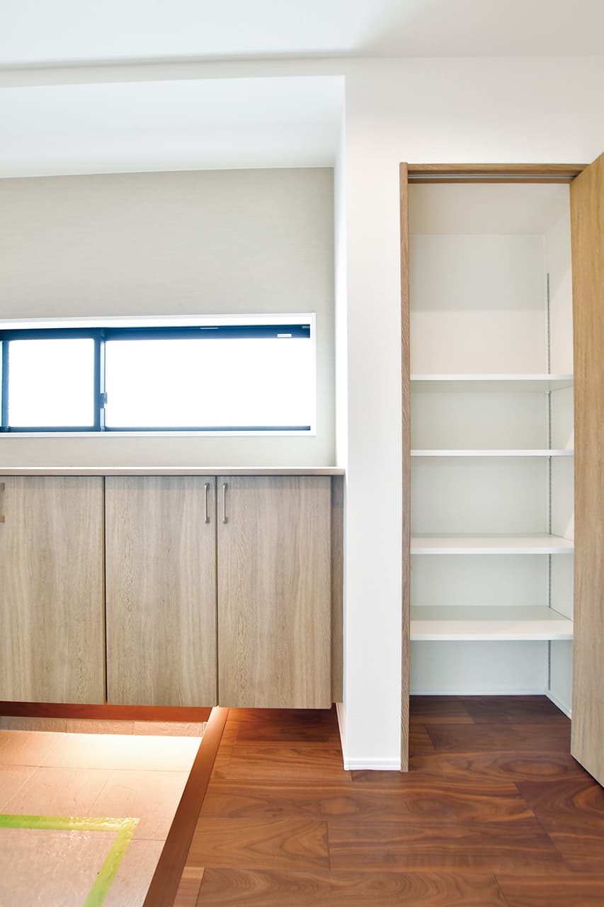 システムキッチンのすぐそばに配置したパントリー。ストック食品や調味料やお酒のほか、非常食や水のペットボトルなどの防災用品も収納できます。キッチンからすぐ手が届く場所にあるから、整理整頓もテキパキできて、キッチン空間をスッキリ保てます。