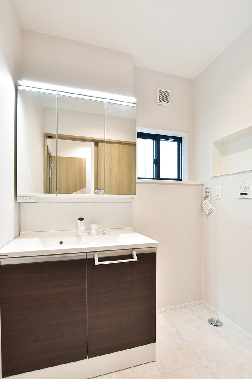 900mm幅の洗面化粧台なので広く使え、毎日の作業もグンと楽になります。ゆとりの収納力でサニタリールームをすっきりと演出します。