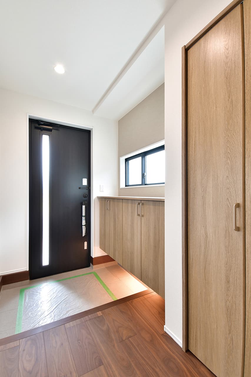 人の動きを感知して自動的に点灯する人感センサー付玄関照明を採用しました。ご家族の帰宅を明るく迎えるだけでなく、不意なライトの光が侵入者への警告になります。