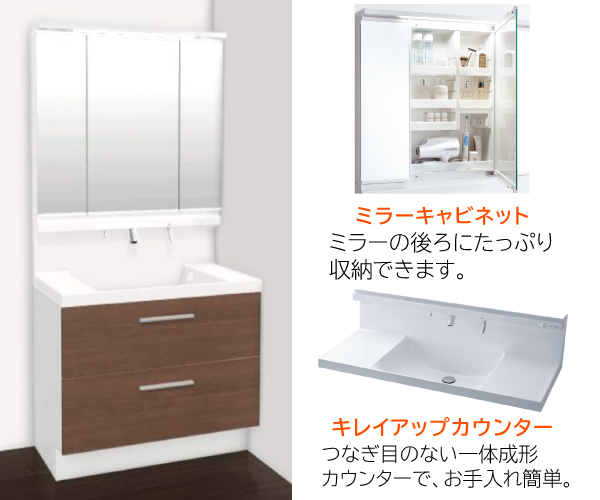 ワイドタイプ洗面化粧台 ワイドな洗面化粧台なので広く使え、毎日の作業もグンと楽になります。ゆとりの収納力でサニタリールームをすっきりと演出します。