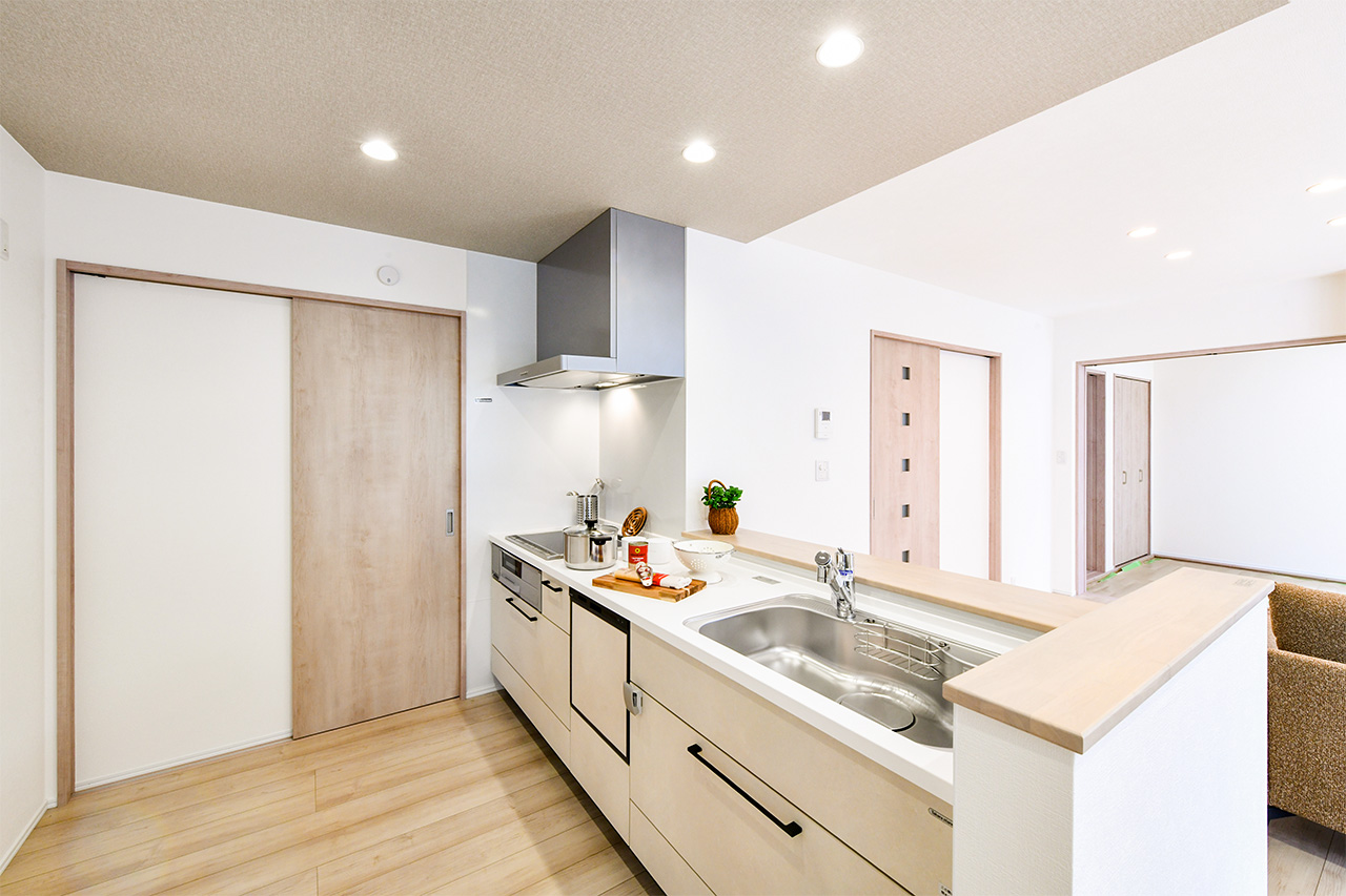 家族でのコミュニケーションがとれる対面型システムキッチン。横一列にシンクとコンロをまとめたシンプルな形です。動きやすさとスタイリッシュなデザインが魅力。