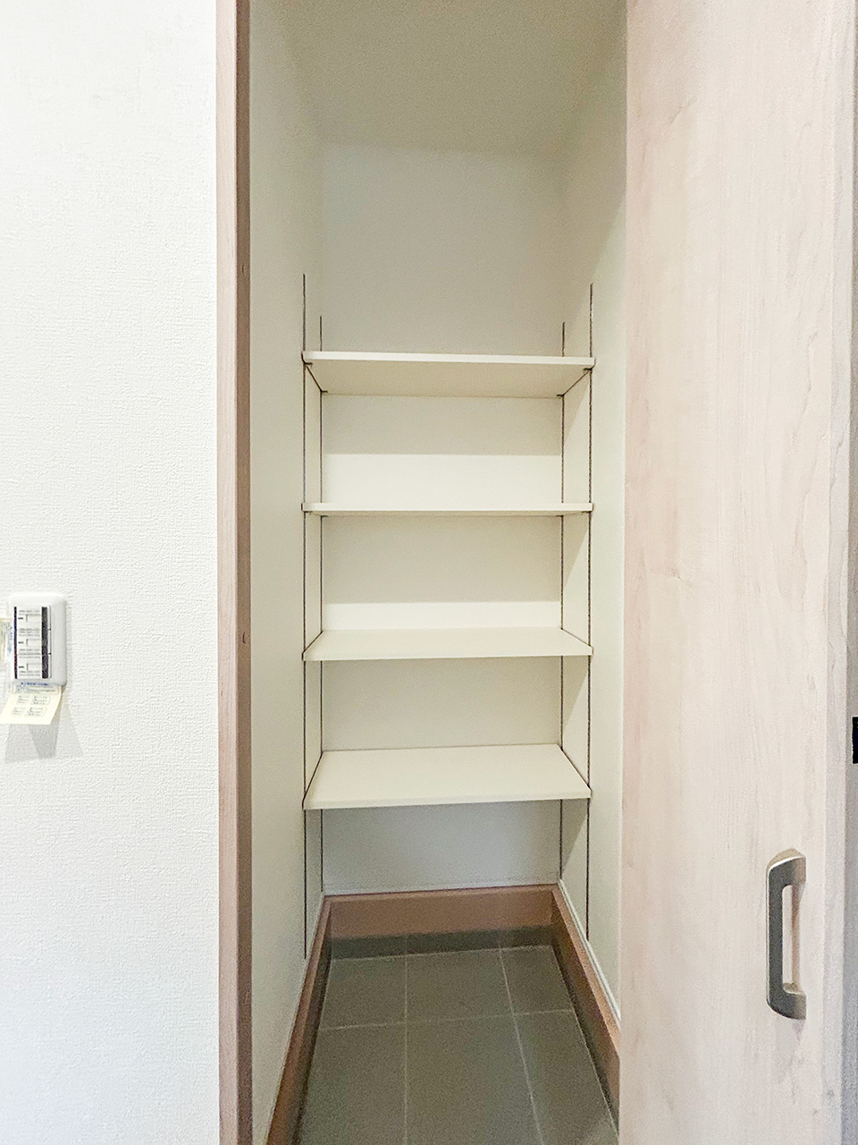 システムキッチンのすぐそばに配置したパントリー。ストック食品や調味料やお酒のほか、非常食や水のペットボトルなどの防災用品も収納できます。キッチンからすぐ手が届く場所にあるから、整理整頓もテキパキできて、キッチン空間をスッキリ保てます。