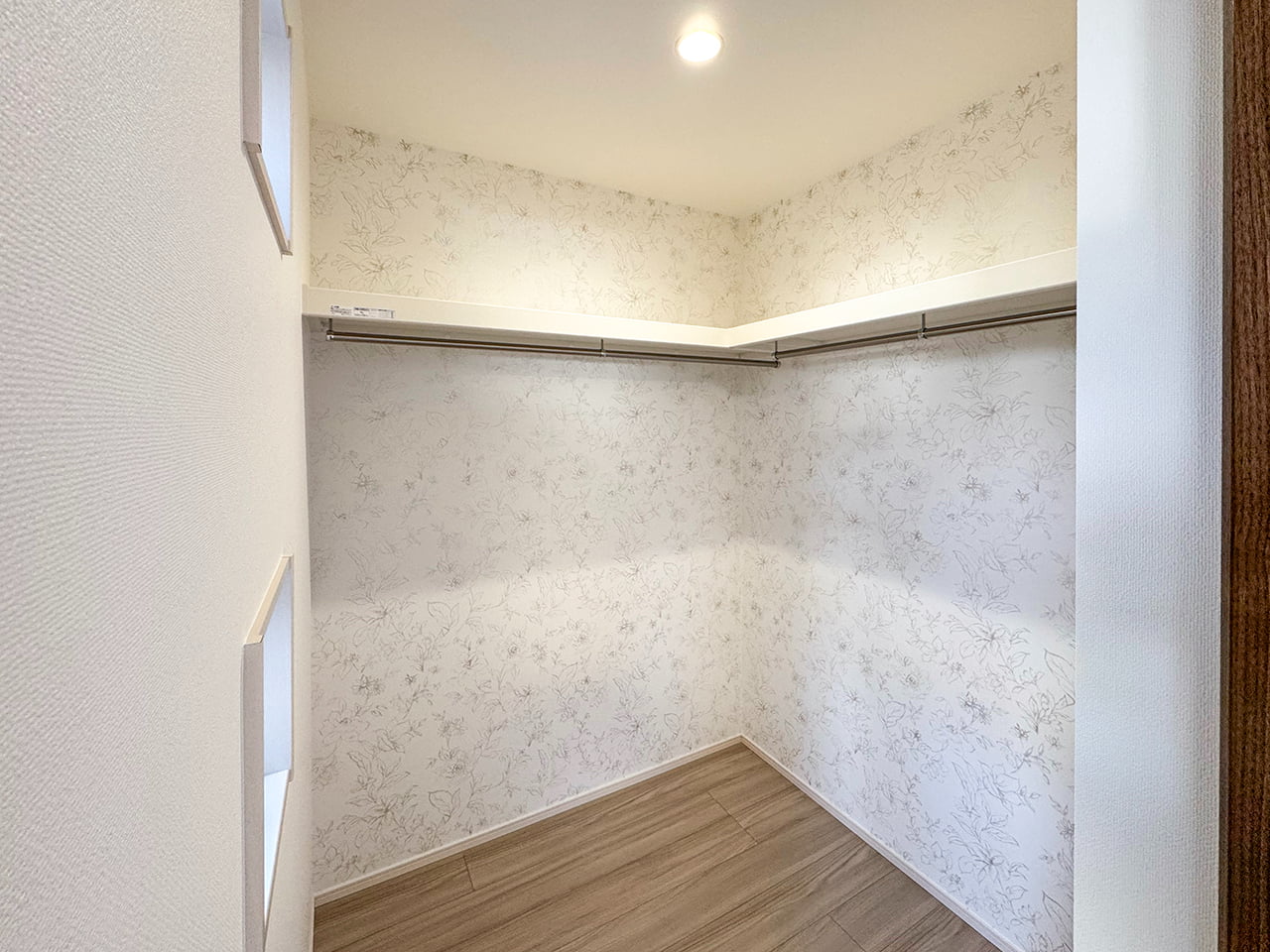 ご夫婦や子ども達の衣類をたっぷりしまえる大容量のウォークインクローゼット。季節の衣類から鞄や帽子などの小物までたっぷり保管可能。ウォークインタイプなので衣類の出し入れや整理整頓もスムーズに行えます。