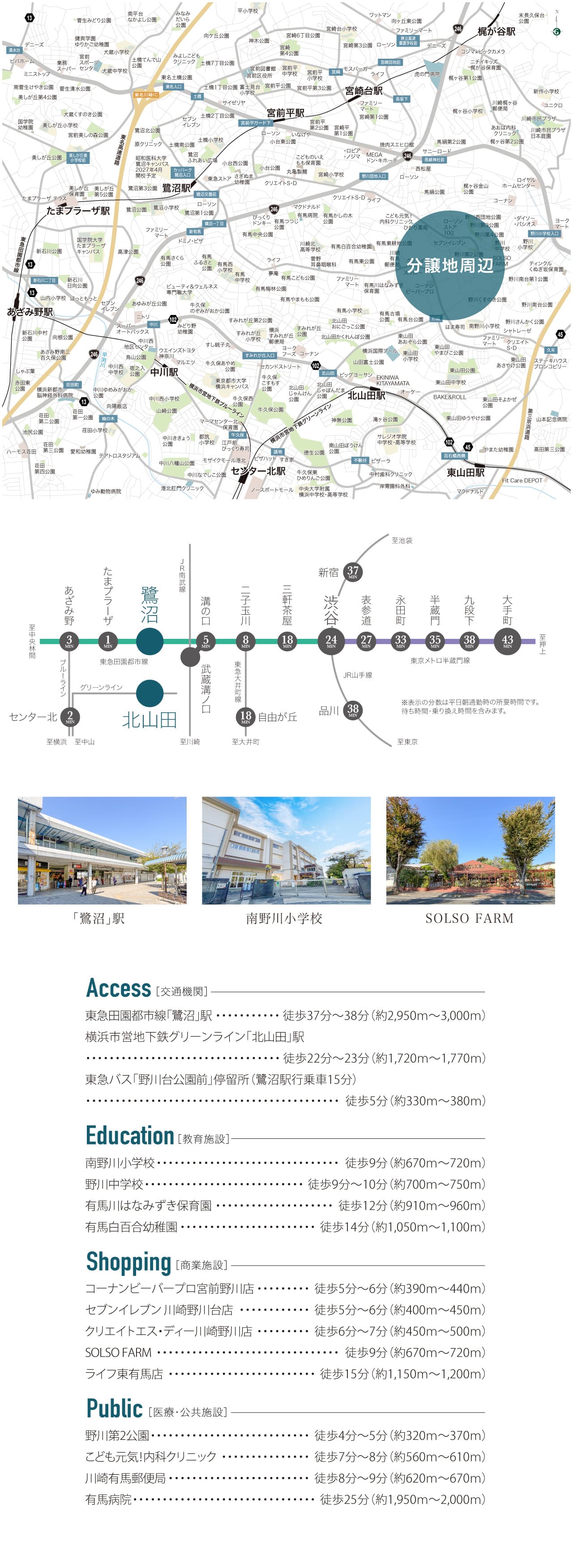 | 交通 | 横浜市営地下鉄グリーンライン「北山田」駅より徒歩 22分( 約1,720m ) 〜 徒歩 23分( 約1,770m ) 東急田園都市線「鷺沼」駅より約2,950m 〜 約3,000m 東急バス「野川台公園前」停留所より徒歩 5分( 約330m ) 〜 徒歩 5分( 約380m ) |