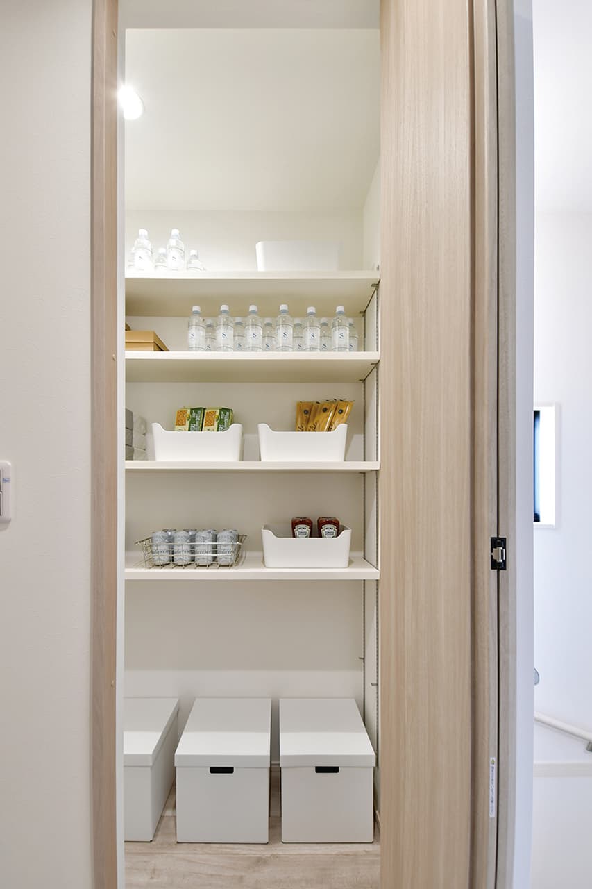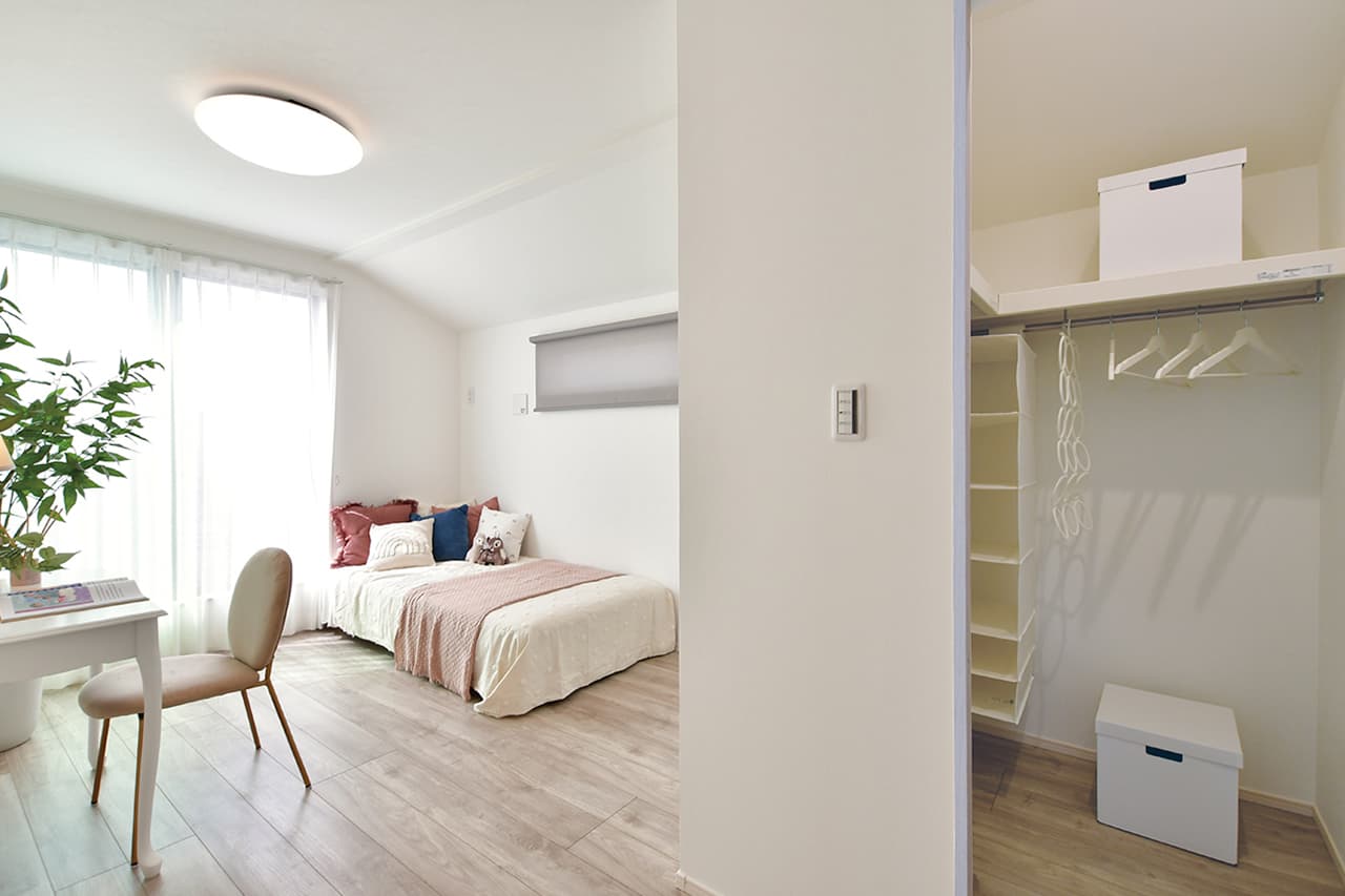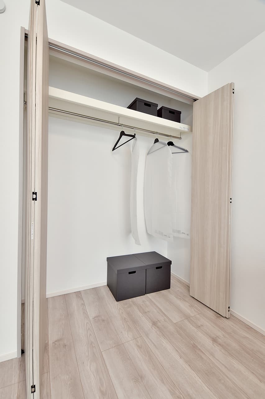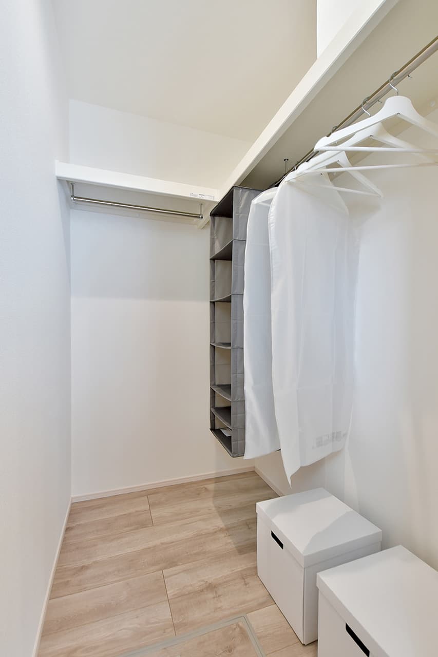 ご夫婦や子ども達の衣類をたっぷりしまえる大容量のウォークインクローゼット。季節の衣類から鞄や帽子などの小物までたっぷり保管可能。ウォークインタイプなので衣類の出し入れや整理整頓もスムーズに行えます。