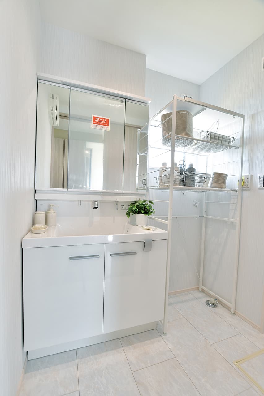 900mm幅の洗面化粧台なので広く使え、毎日の作業もグンと楽になります。ゆとりの収納力でサニタリールームをすっきりと演出します。ミラーの後ろにたっぷり収納できます。つなぎ目のない一体成形カウンターで、お手入れ簡単。