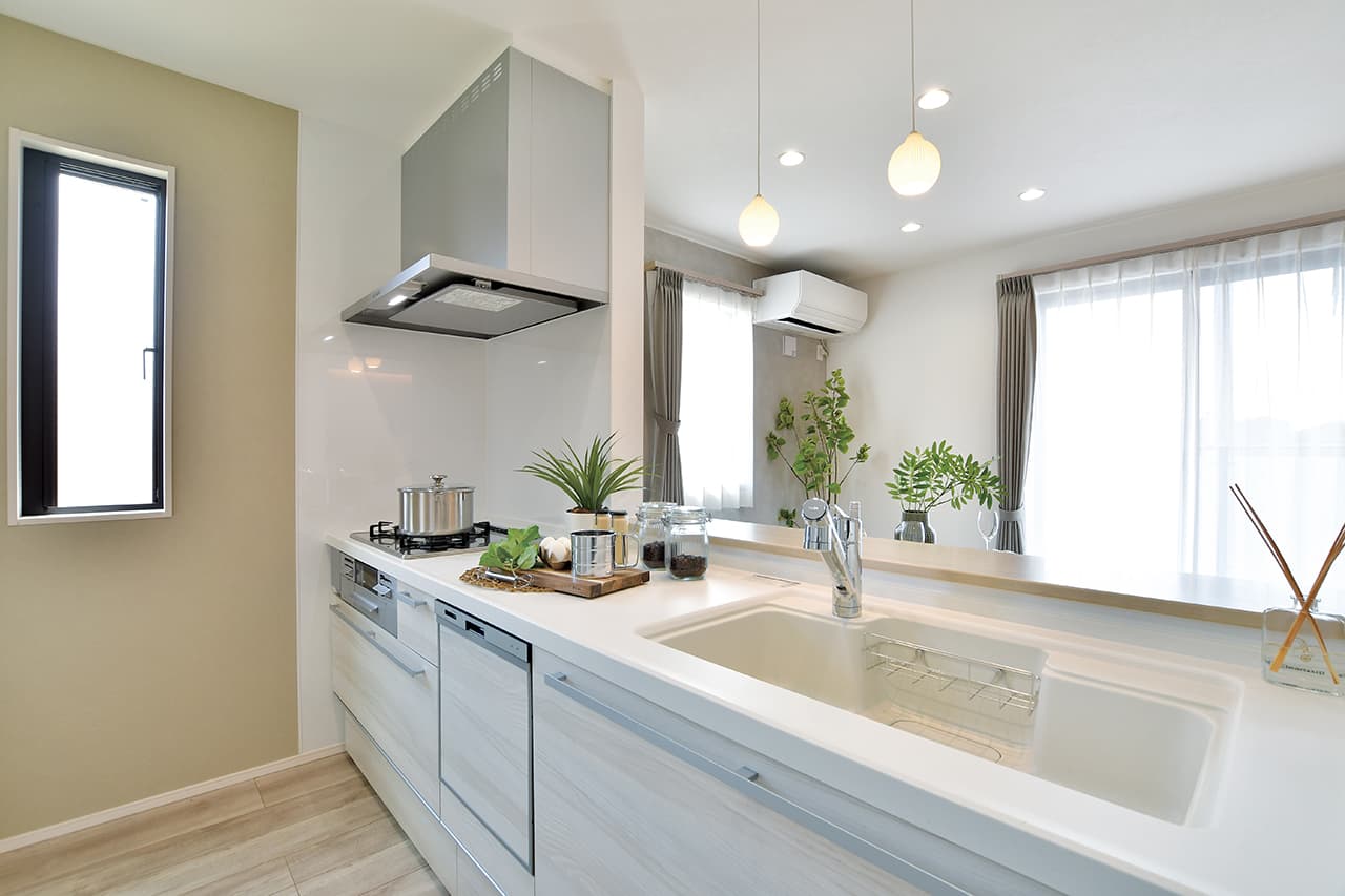 家族でのコミュニケーションがとれる対面型システムキッチンです。横一列にシンクとコンロをまとめたシンプルな形です。動きやすさとスタイリッシュなデザインが魅力です。