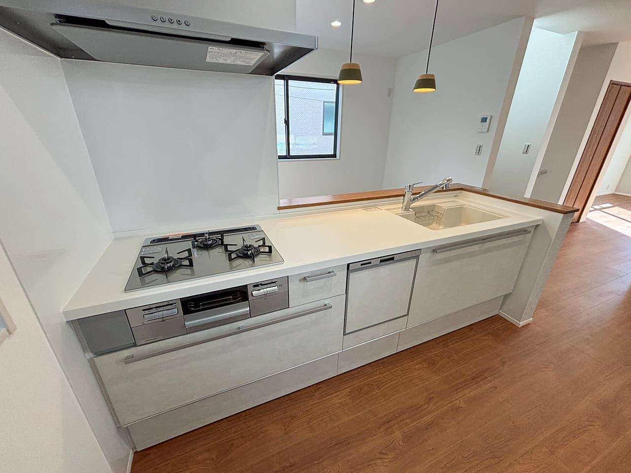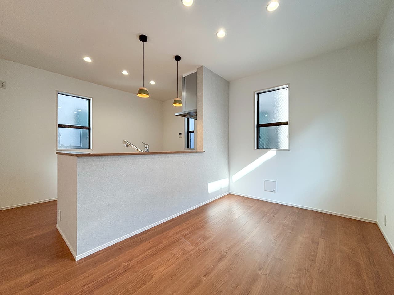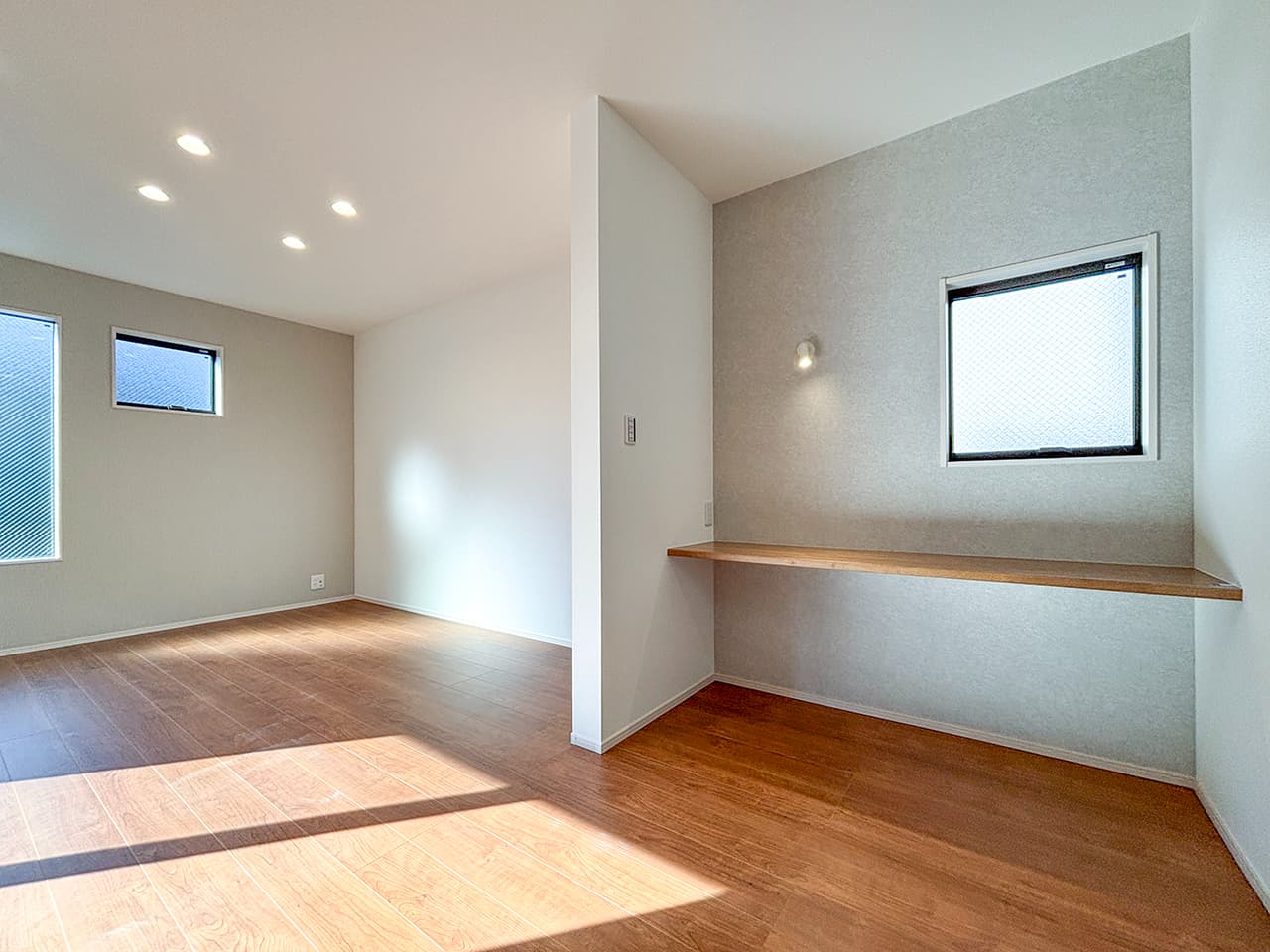 LDKにレイアウトしたカウンタースペース。子ども達の学習スペースやパパのSOHOスペース、ママのワーキングスペースなど、用途やスタイルに応じて多彩に活躍。家族のそばでみんなが利用できるライブラリー空間です。