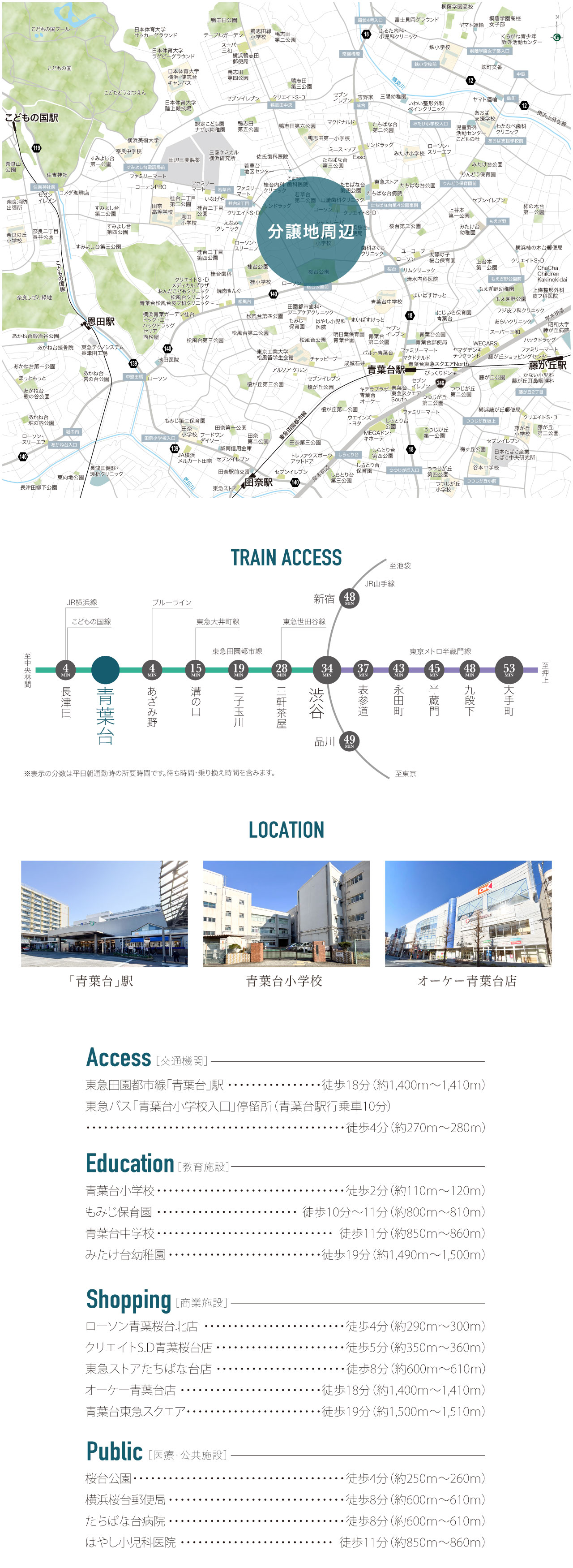 | 交通 | 東急田園都市線「青葉台」駅より徒歩 18分( 約1,400m ) 〜 徒歩 18分( 約1,410m ) 東急バス「青葉台小学校入口」停留所より徒歩 4分( 約270m ) 〜 徒歩 4分( 約280m ) |
