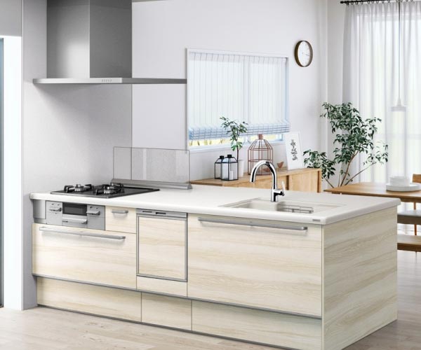 家族でのコミュニケーションがとれる対面型システムキッチンです。横一列にシンクとコンロをまとめたシンプルな形です。動きやすさとスタイリッシュなデザインが魅力です。