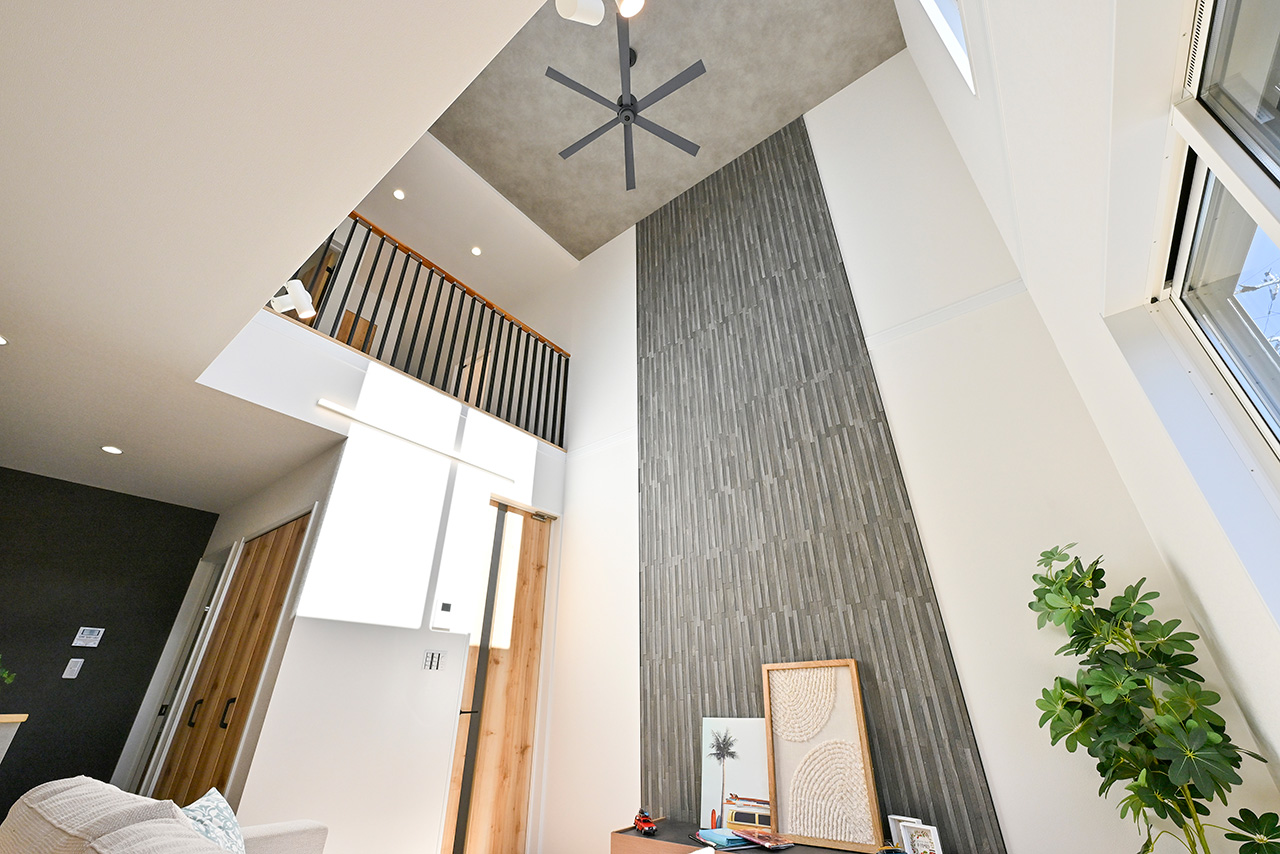 縦に広がる吹抜けLDKや大型収納で空間を整える、開放的な住まい