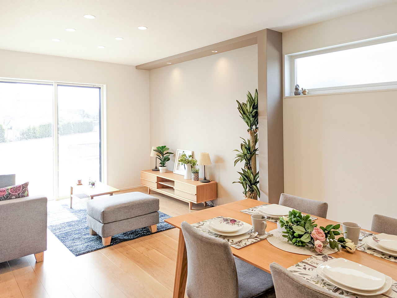 上質感を高める間接照明や、明るく開放的な窓が印象的なLDK