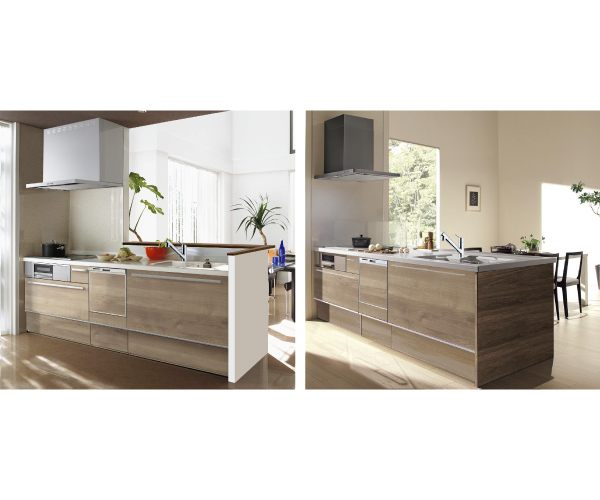 家族でのコミュニケーションがとれる対面型システムキッチンです。横一列にシンクとコンロをまとめたシンプルな形です。動きやすさとスタイリッシュなデザインが魅力です。
