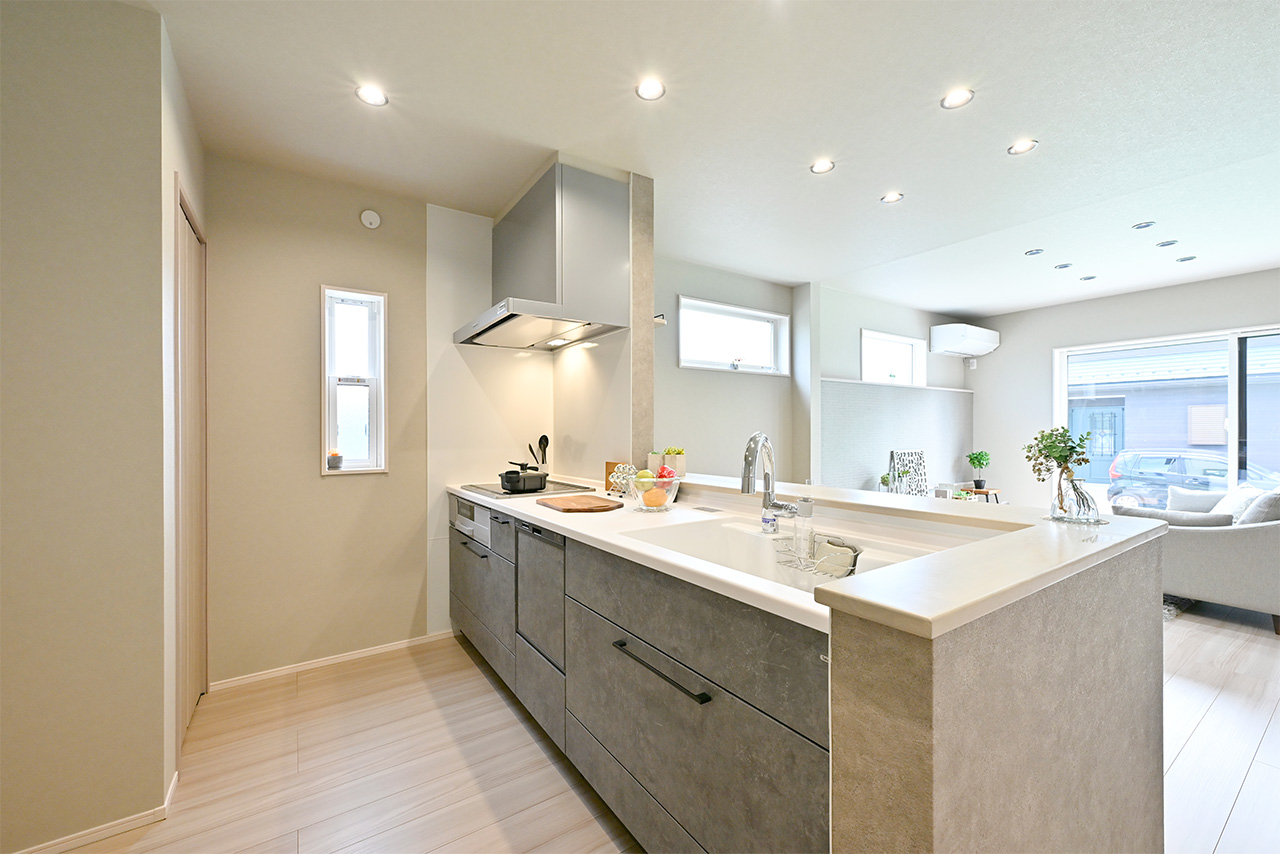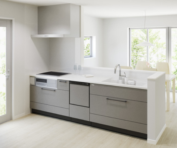 家族でのコミュニケーションがとれる対面型システムキッチン。横一列にシンクとコンロをまとめたシンプルな形です。動きやすさとスタイリッシュなデザインが魅力。