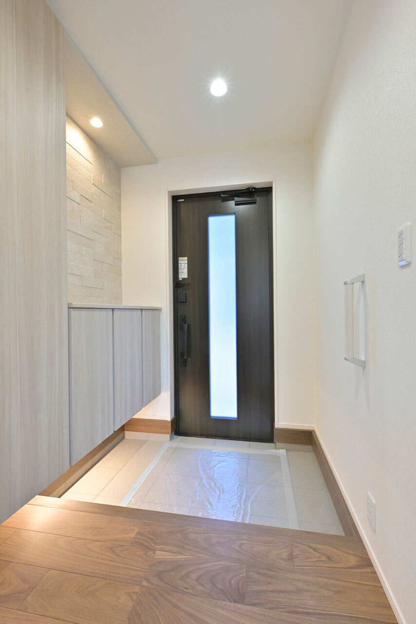 エントランスホールに施した間接照明。温かく幻想的な光が空間を印象的な雰囲気に。やわらかな光が足元を照らし、視認性を高めると共に、空間を広く感じさせる効果も生まれます。洗練されたデザインがご家族やお客様を心地よく落ち着いた雰囲気でお迎えします。