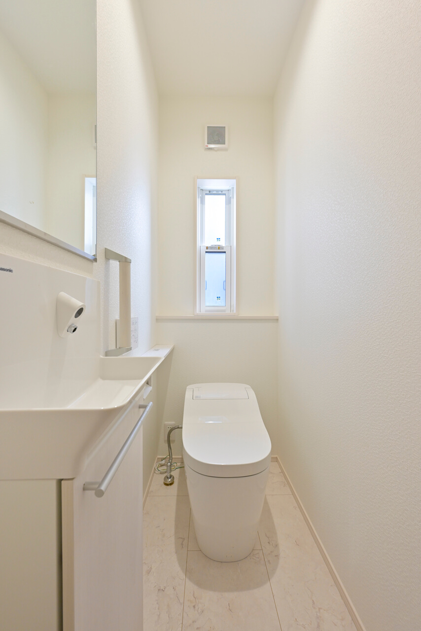 座る・立つといった動作が足腰への大きな負担をかけるトイレ。握りやすい位置に手すりを設置して、負担の軽減に配慮しています。