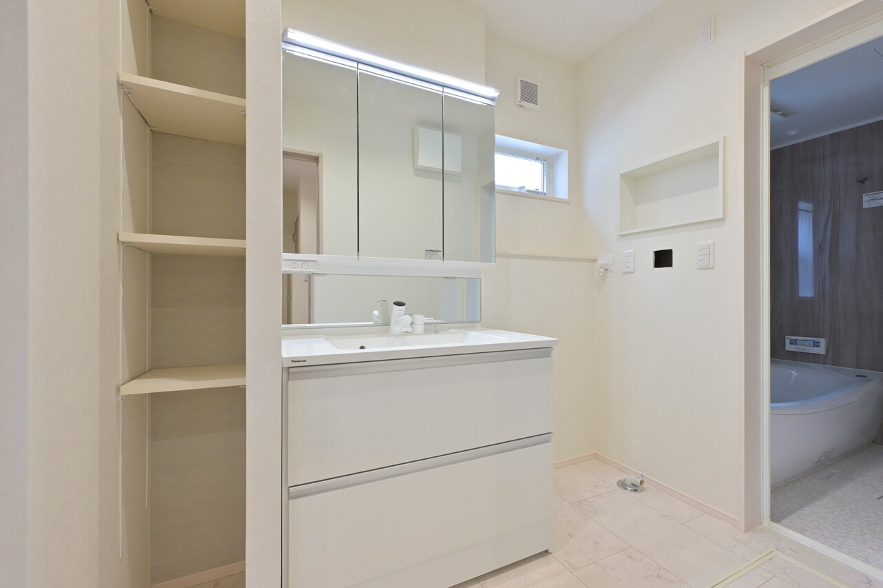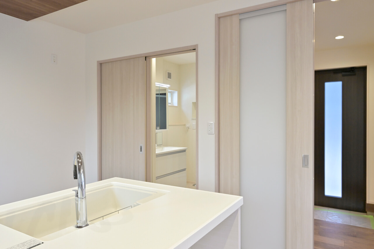 キッチンから洗面室・浴室までを最短距離で結んだ水回り動線設計。家事の移動距離を短縮するとともに、動線上には収納スペースなどをレイアウトし機能性も高めました。スマートな動線設計と時短設備が子育てにがんばるご家族をサポートします。