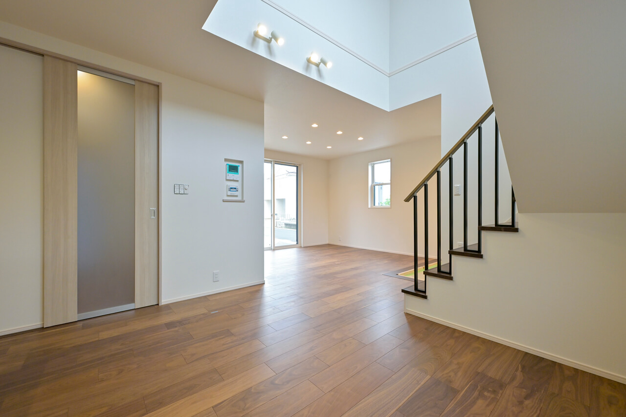 ご家族の団らんや寛ぎの中心となるリビング空間をさらに際立たせる吹抜け天井プラン。2階天井まで続くその圧倒的な存在感と広がりが訪れた方を驚きを持ってお迎えします。大切にしたいご家族やゲストをもてなす上質な空間です。