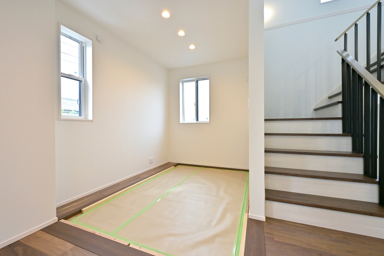 LDKと緩やかに繋がるタタミコーナー。柔らかい畳の上でお昼寝したり、子どもと寝そべって本を読み聞かせしたり、時にはお座敷スタイルで一味違うディナーを楽しんだり。ちょっと贅沢な時間を楽しめる個性的な和モダン空間です。