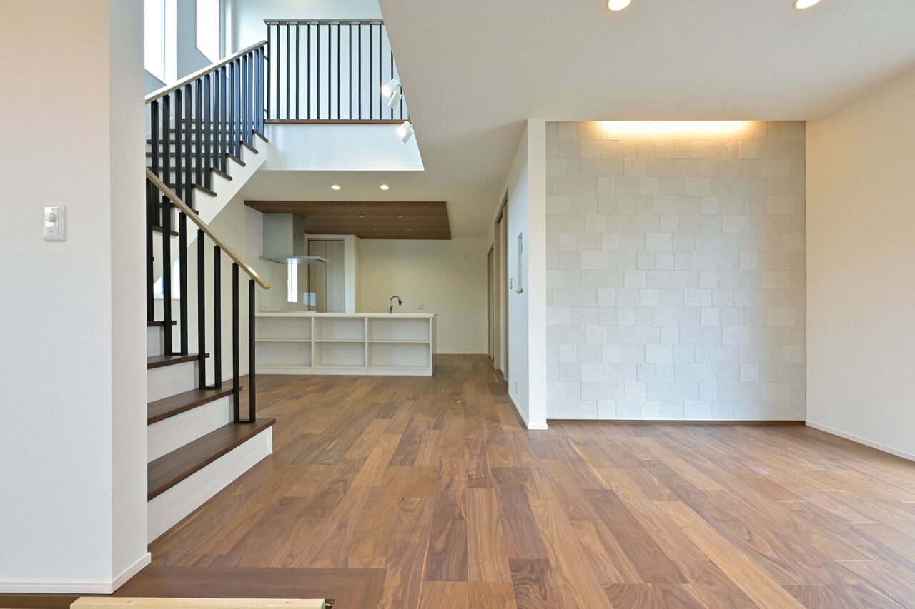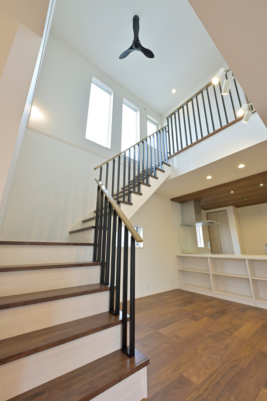2階へ向かう際に、自然とリビングを通るよう設計された「リビング階段」。みんなが集まる広場へ続く階段のように、2階のプライベートな空間とパブリックなLDKを程よい距離感で結び、親子のコミュニケーションを自然と深めてくれます。