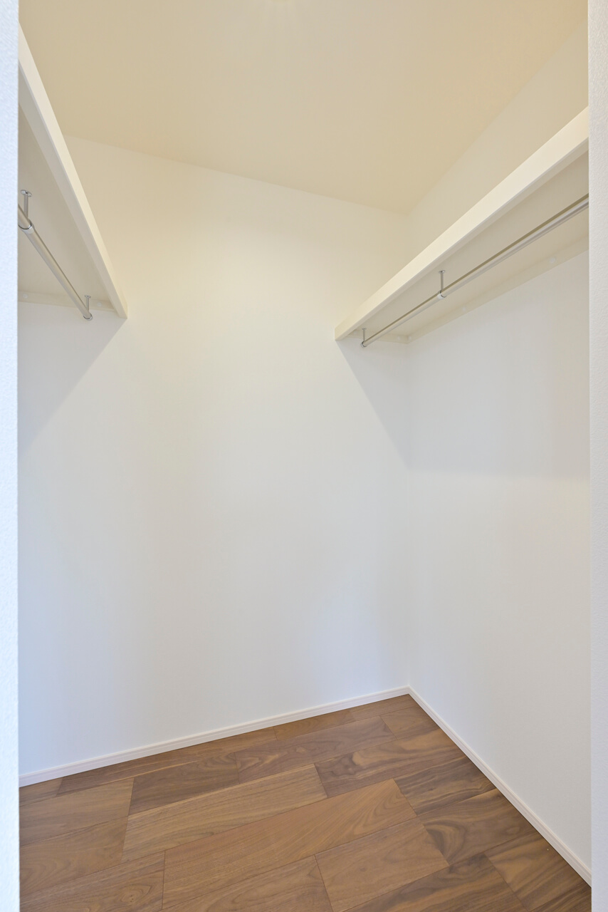 ご夫婦や子ども達の衣類をたっぷりしまえる大容量のウォークインクローゼット。季節の衣類から鞄や帽子などの小物までたっぷり保管可能。ウォークインタイプなので衣類の出し入れや整理整頓もスムーズに行えます。