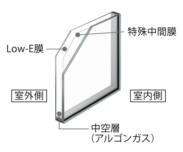 室外側ガラスにコーティングした特殊金属膜が夏の日差しを約60%カット。冷暖房効率を高め、紫外線もカットします。また、中空層には空気より熱を通しにくいアルゴンガスを封入し断熱性能を高めています。