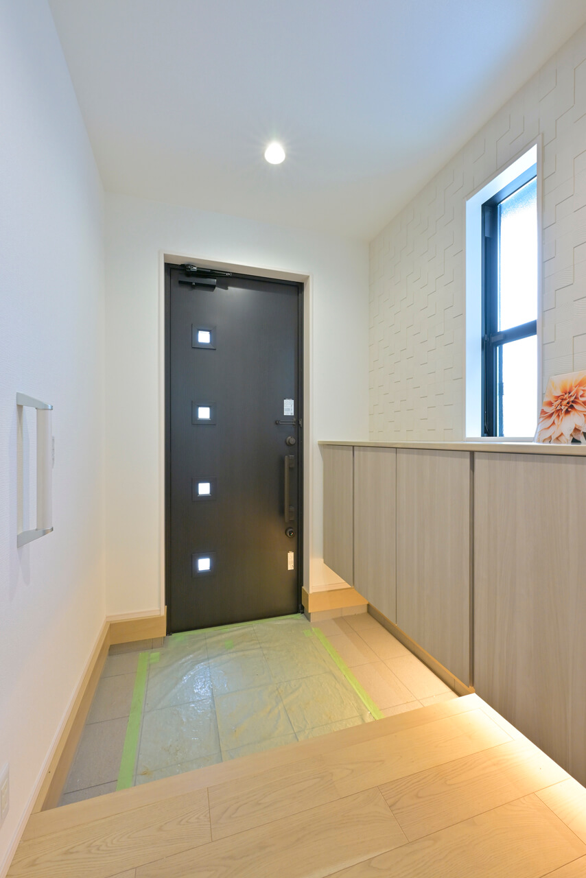 人感センサー付玄関照明 人の動きを感知して自動的に点灯する人感センサー付玄関照明を採用しました。ご家族の帰宅を明るく迎えるだけでなく、不意なライトの光が侵入者への警告になります。