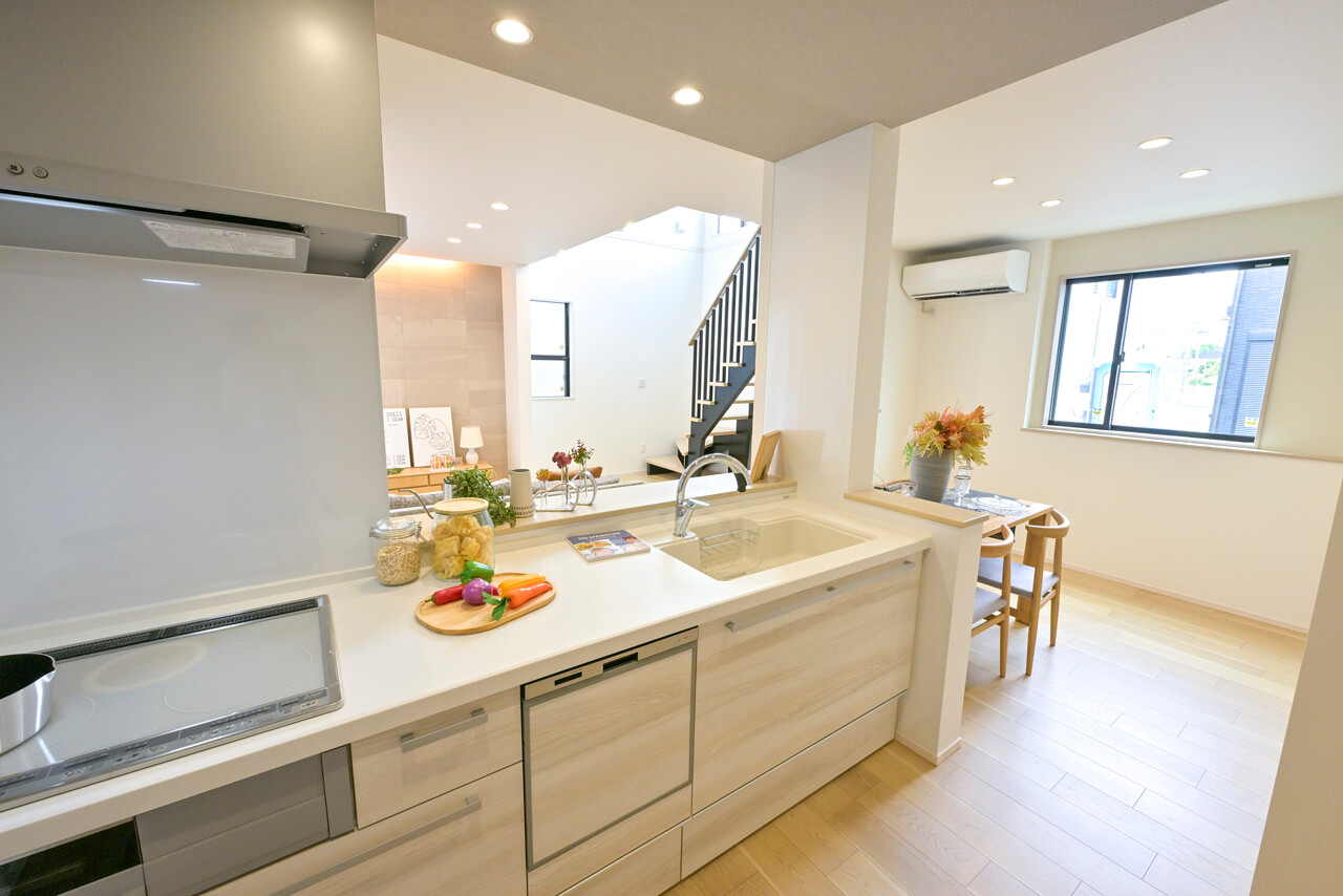 システムキッチン 家族でのコミュニケーションがとれる対面型システムキッチンです。横一列にシンクとコンロをまとめたシンプルな形です。動きやすさとスタイリッシュなデザインが魅力です。