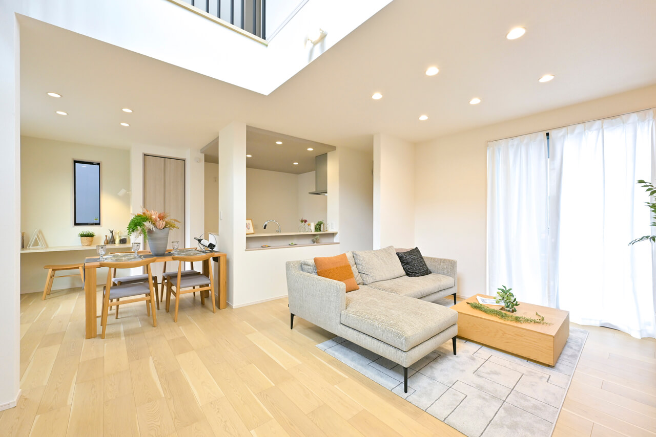 閉じる 吹抜け ご家族の団らんや寛ぎの中心となるリビング空間をさらに際立たせる吹抜け天井プラン。2階天井まで続くその圧倒的な存在感と広がりが訪れた方を驚きを持ってお迎えします。大切にしたいご家族やゲストをもてなす上質な空間です。