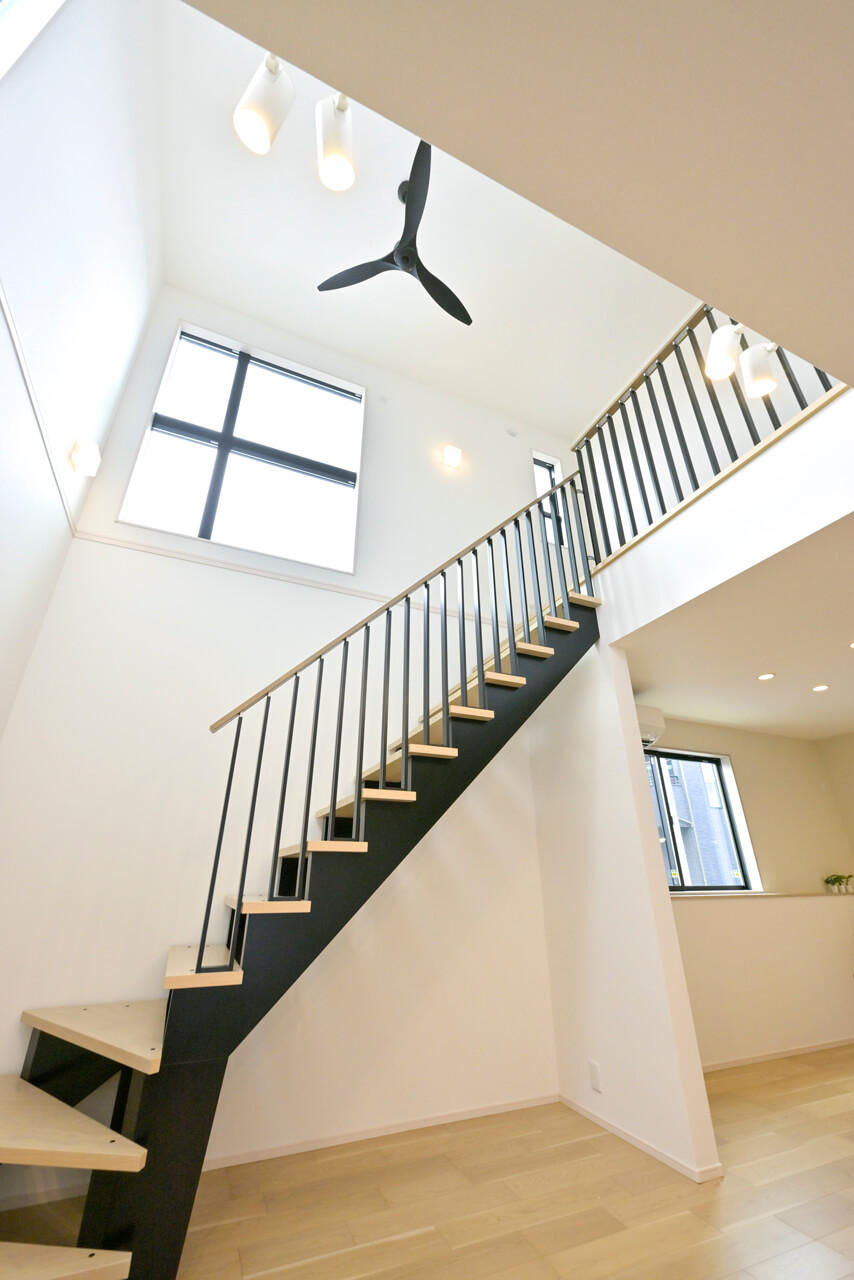 閉じる リビング階段 2階へ向かう際に、自然とリビングを通るよう設計された「リビング階段」。みんなが集まる広場へ続く階段のように、2階のプライベートな空間とパブリックなLDKを程よい距離感で結び、親子のコミュニケーションを自然と深めてくれます。