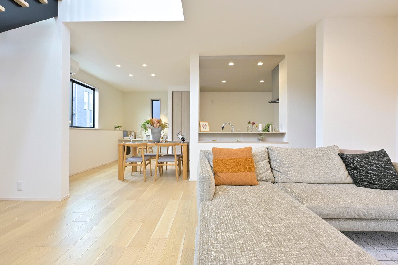 LDK18帖以上 リビングという暮らしのメインスペースは、一日で家族が一番長く過ごす場所。その居心地をさらに高めるために18帖以上のワイドな広さを確保しました。広場のようなパブリックスペースがご家族の集いや団らんを心地よく育みます。