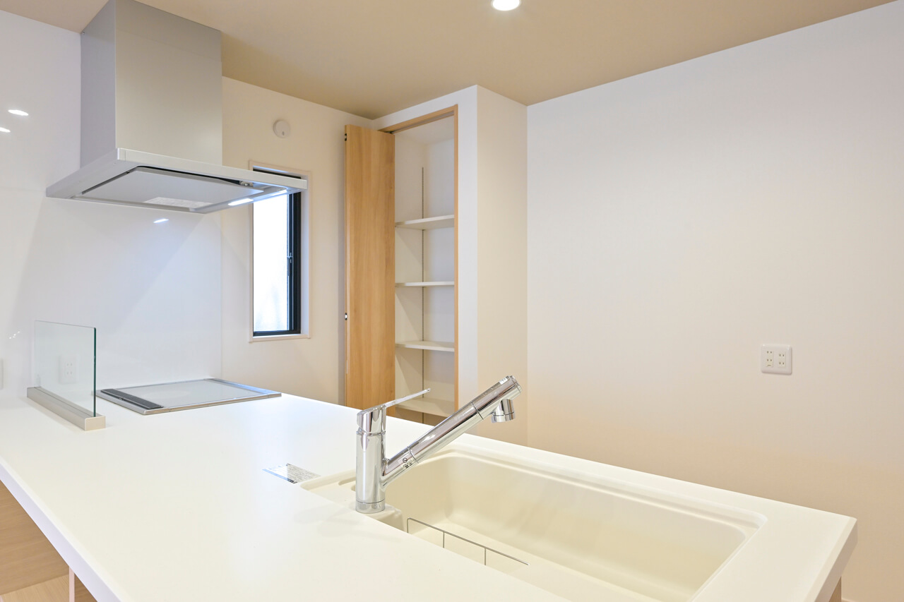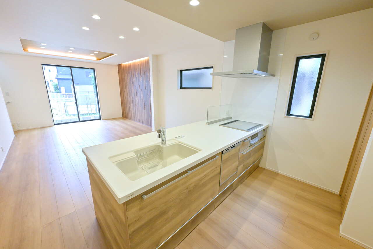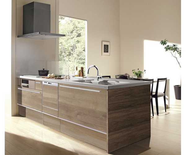 家族でのコミュニケーションがとれる対面型システムキッチンです。横一列にシンクとコンロをまとめたシンプルな形です。動きやすさとスタイリッシュなデザインが魅力です。