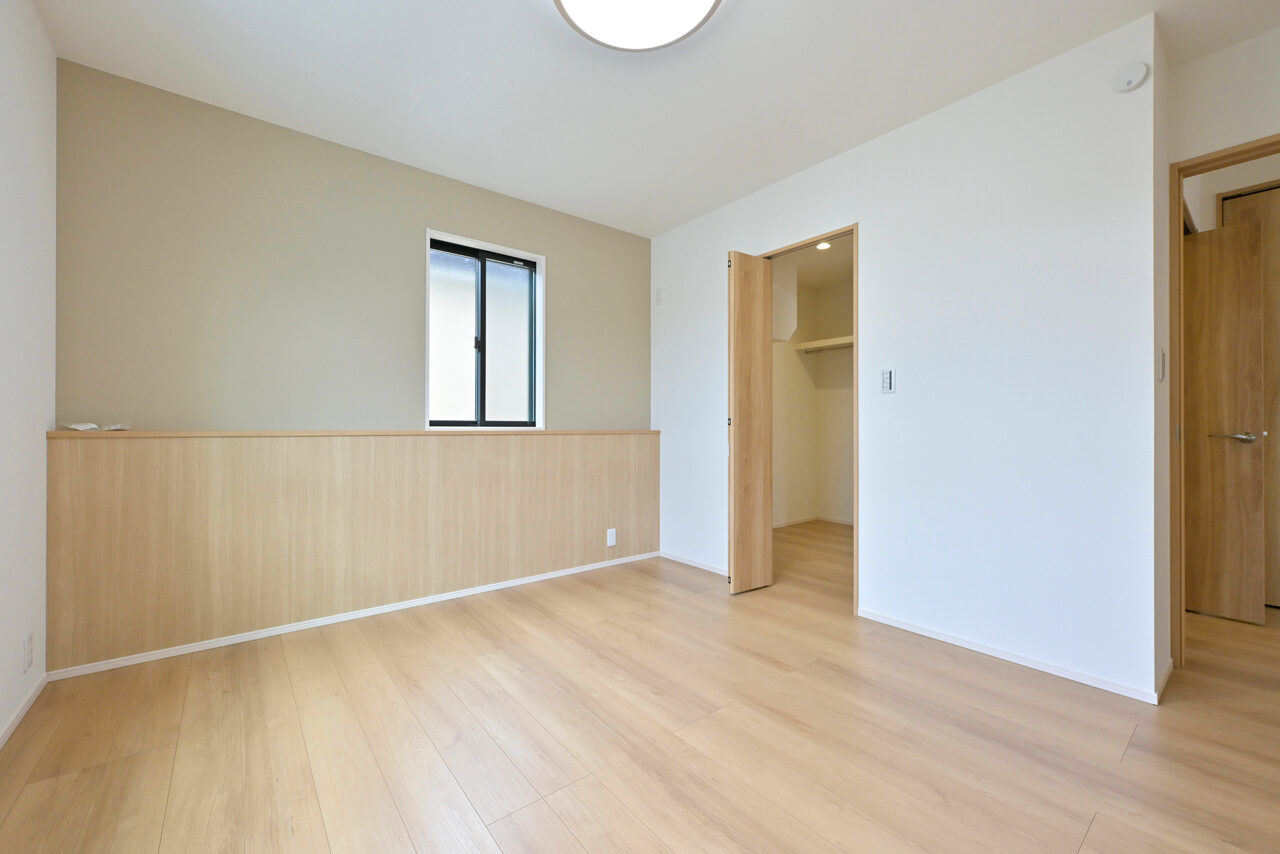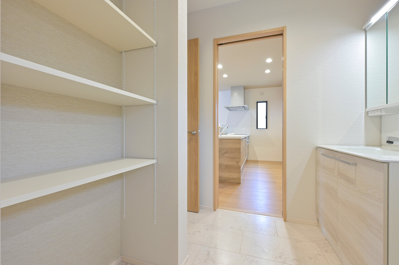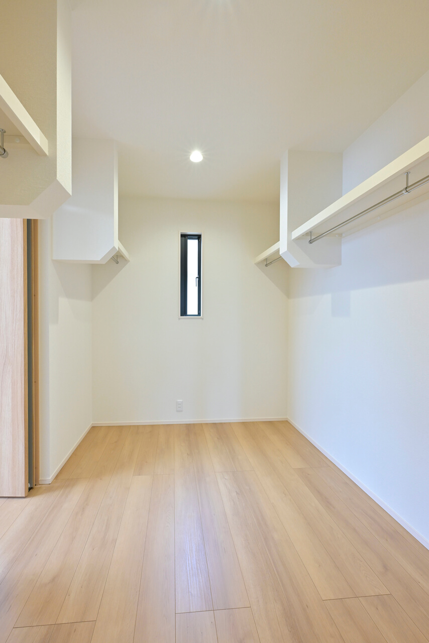 ご夫婦の衣類をたっぷり整頓できる大容量のウォークインクローゼットと、季節の家電や家具など大きな物も仕舞える納戸がひとつになった収納空間。使い勝手のいい主寝室とホールの両方から出入りできる2WAYタイプです。