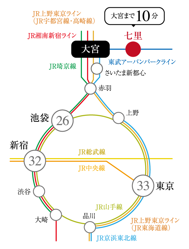 ※記載の所要時間(分数)は、平日朝の通勤時間帯を基準にしています。待ち時間・乗換時間を含みます。