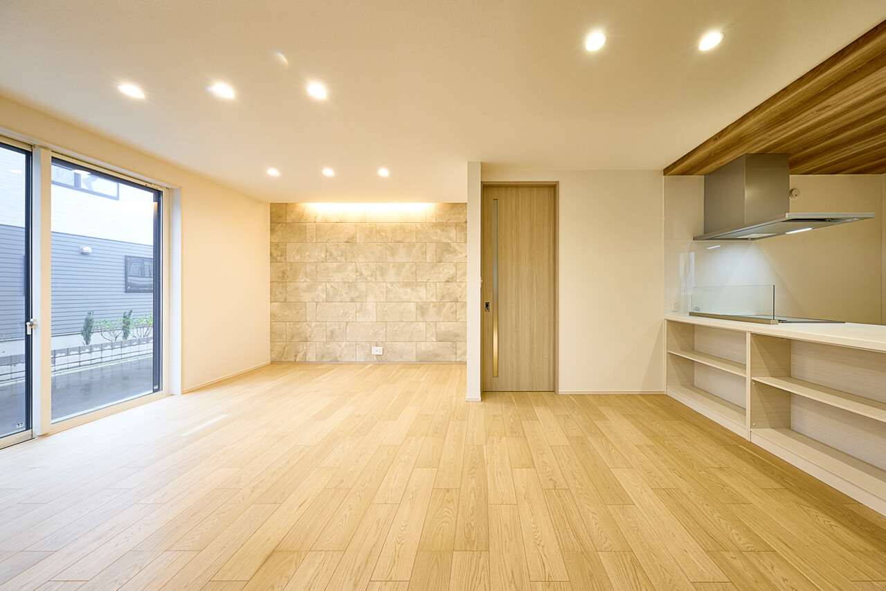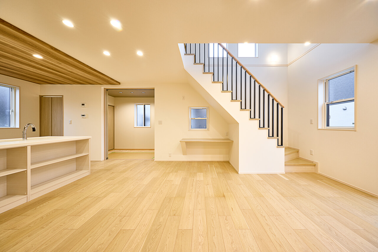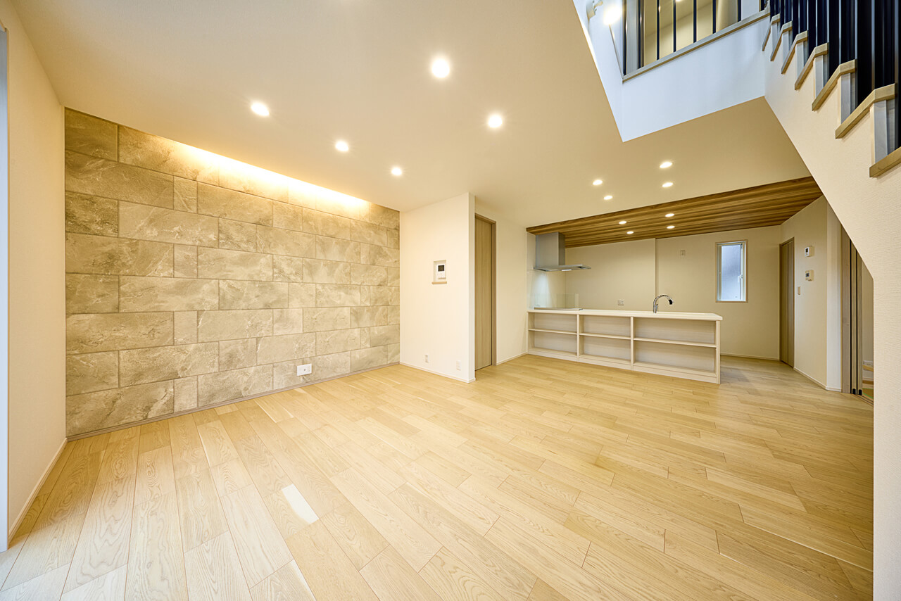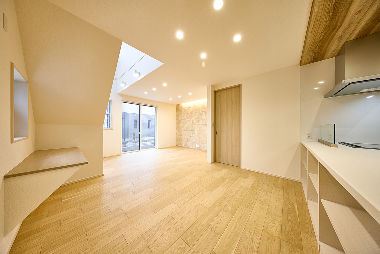 LDK空間の広さをより実感できるオープンキッチン。開放的で目線を遮るものがなくコミュニケーションが取りやすいため、料理をしながらの会話も弾み、お手伝いにも気軽に参加できます。