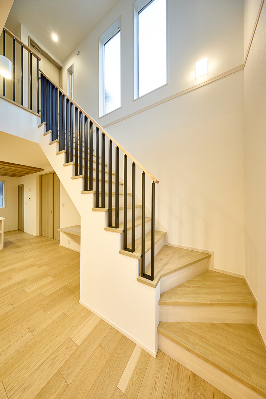 ご家族の団らんや寛ぎの中心となるリビング空間をさらに際立たせる吹抜け天井プラン。2階天井まで続くその圧倒的な存在感と広がりが訪れた方を驚きを持ってお迎えします。大切にしたいご家族やゲストをもてなす上質な空間です。