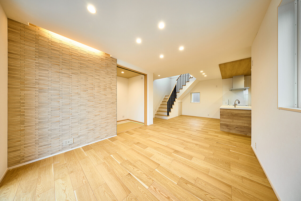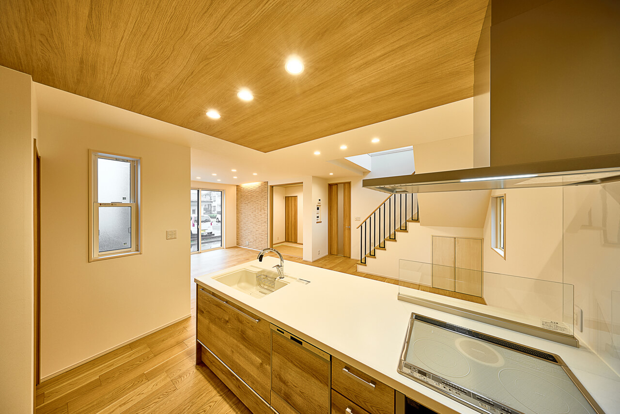 リビングやキッチンの天井に設えた間接照明。やわらかで幻想的な光の演出が、空間を落ち着いた雰囲気に包んでくれます。ご家族の特別な日のサプライズや照明を活かしたインテリアコーディネートなど暮らしに楽しさをプラス。居心地を高め、深める空間プランニングです。