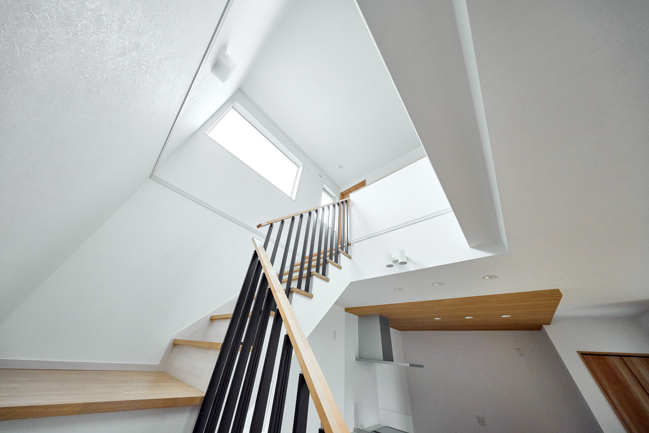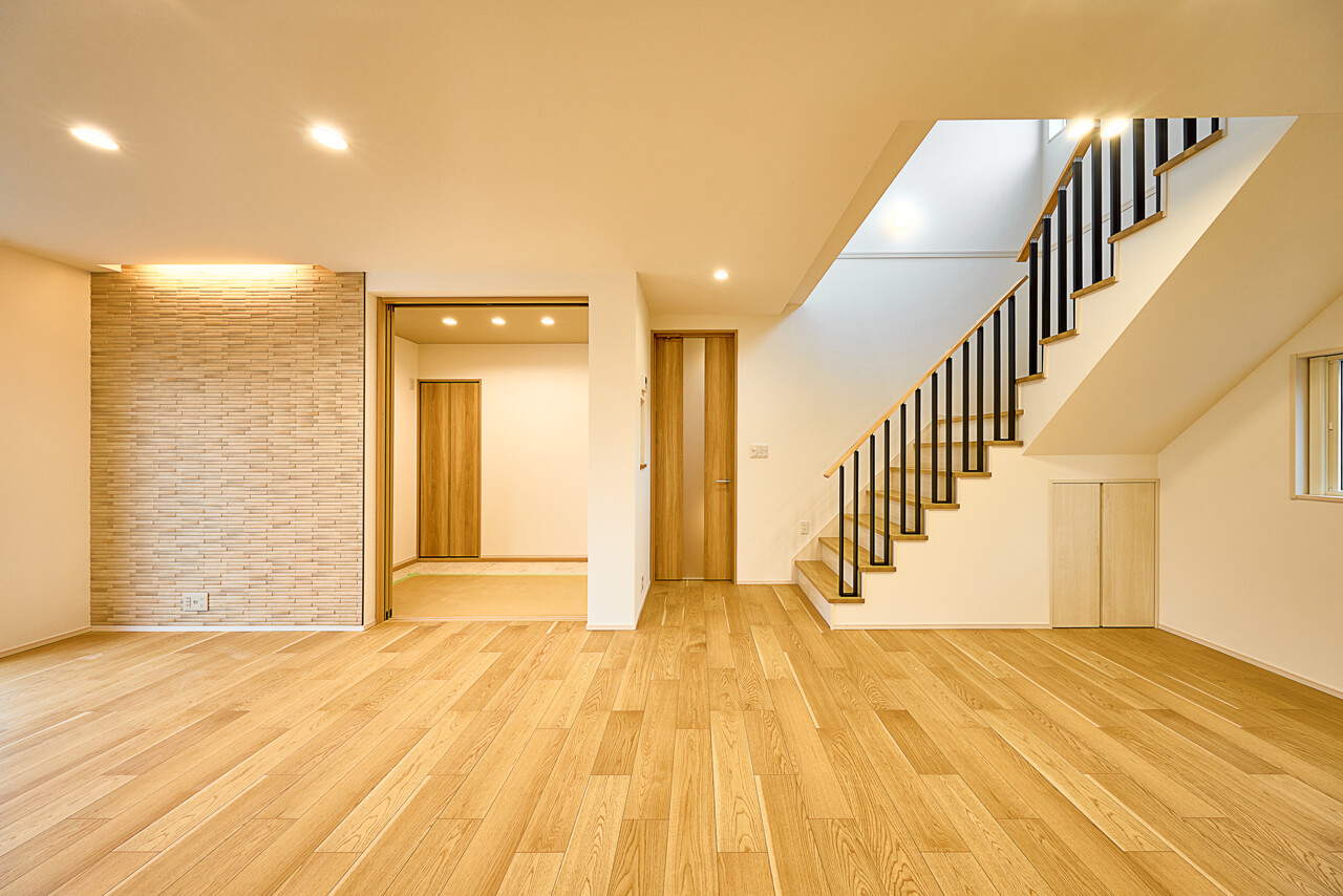 2階へ向かう際に、自然とリビングを通るよう設計された「リビング階段」。みんなが集まる広場へ続く階段のように、2階のプライベートな空間とパブリックなLDKを程よい距離感で結び、親子のコミュニケーションを自然と深めてくれます。