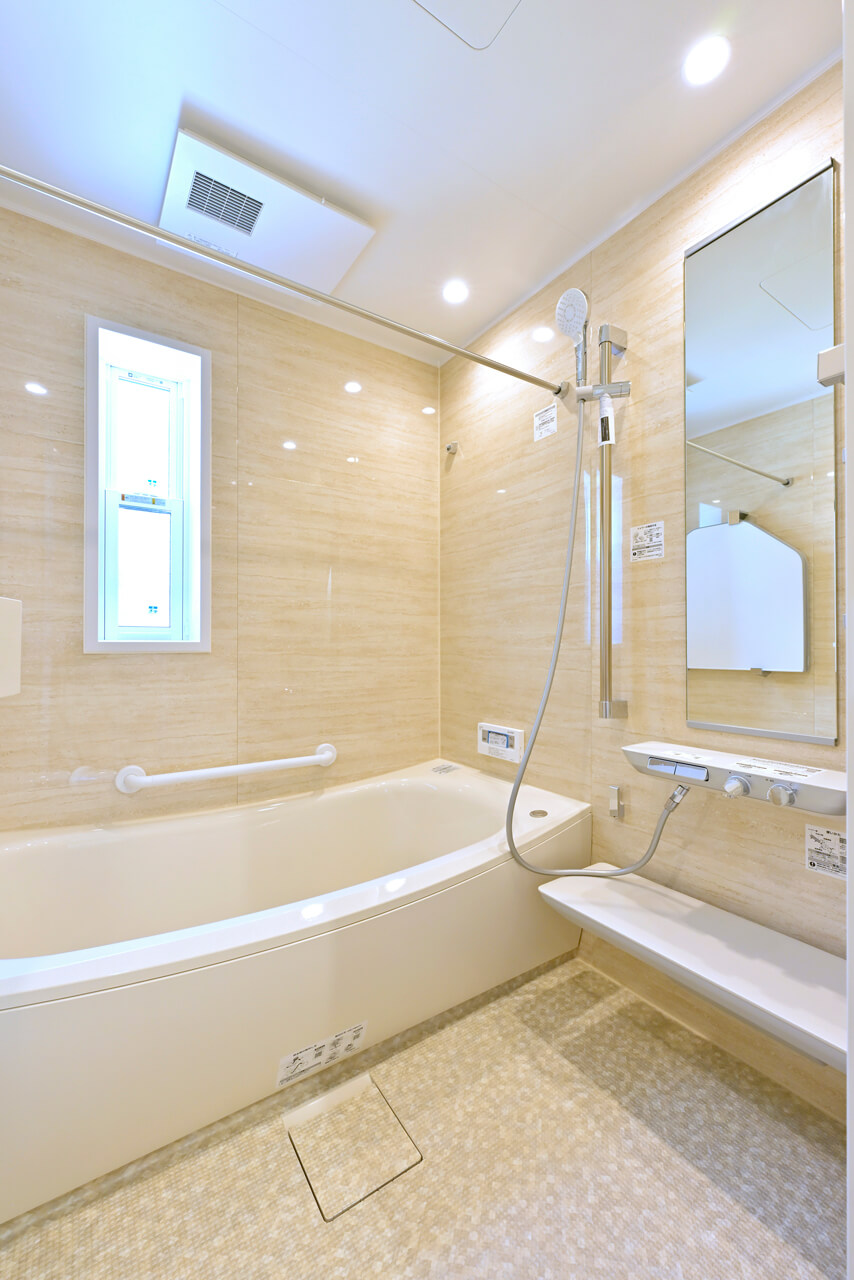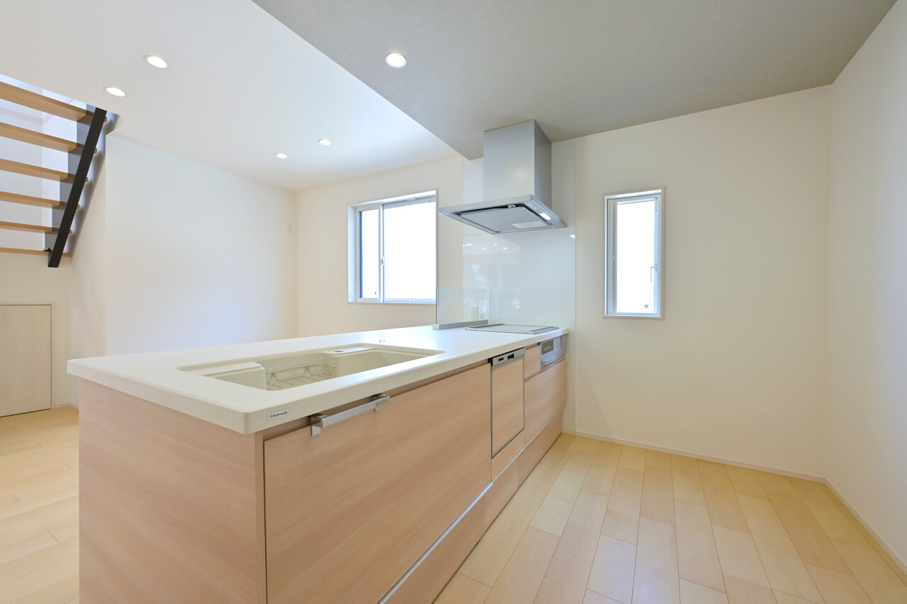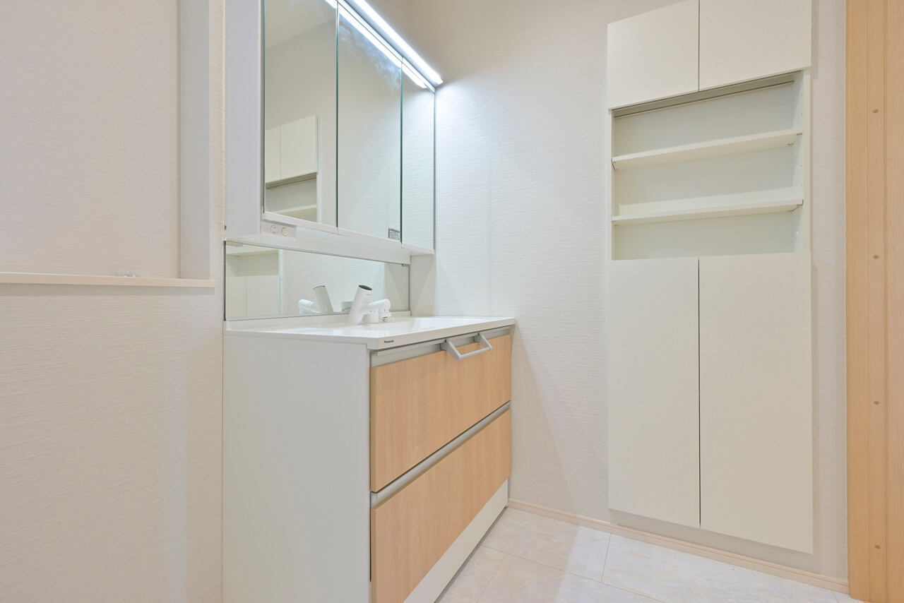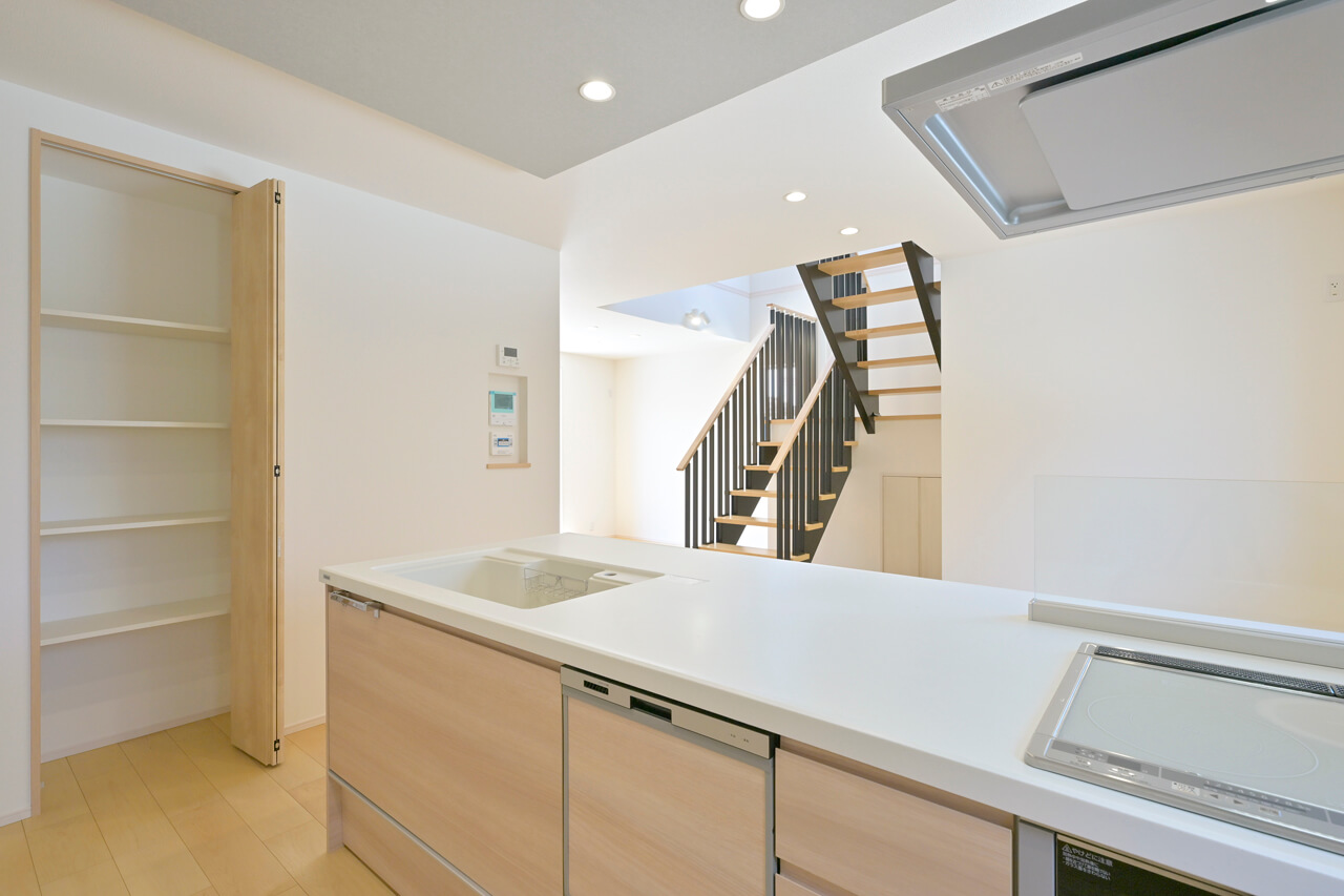 キッチンから洗面室・浴室までを最短距離で結んだ水回り動線設計。家事の移動距離を短縮するとともに、動線上には収納スペースなどをレイアウトし機能性も高めました。スマートな動線設計と時短設備が子育てにがんばるご家族をサポートします。